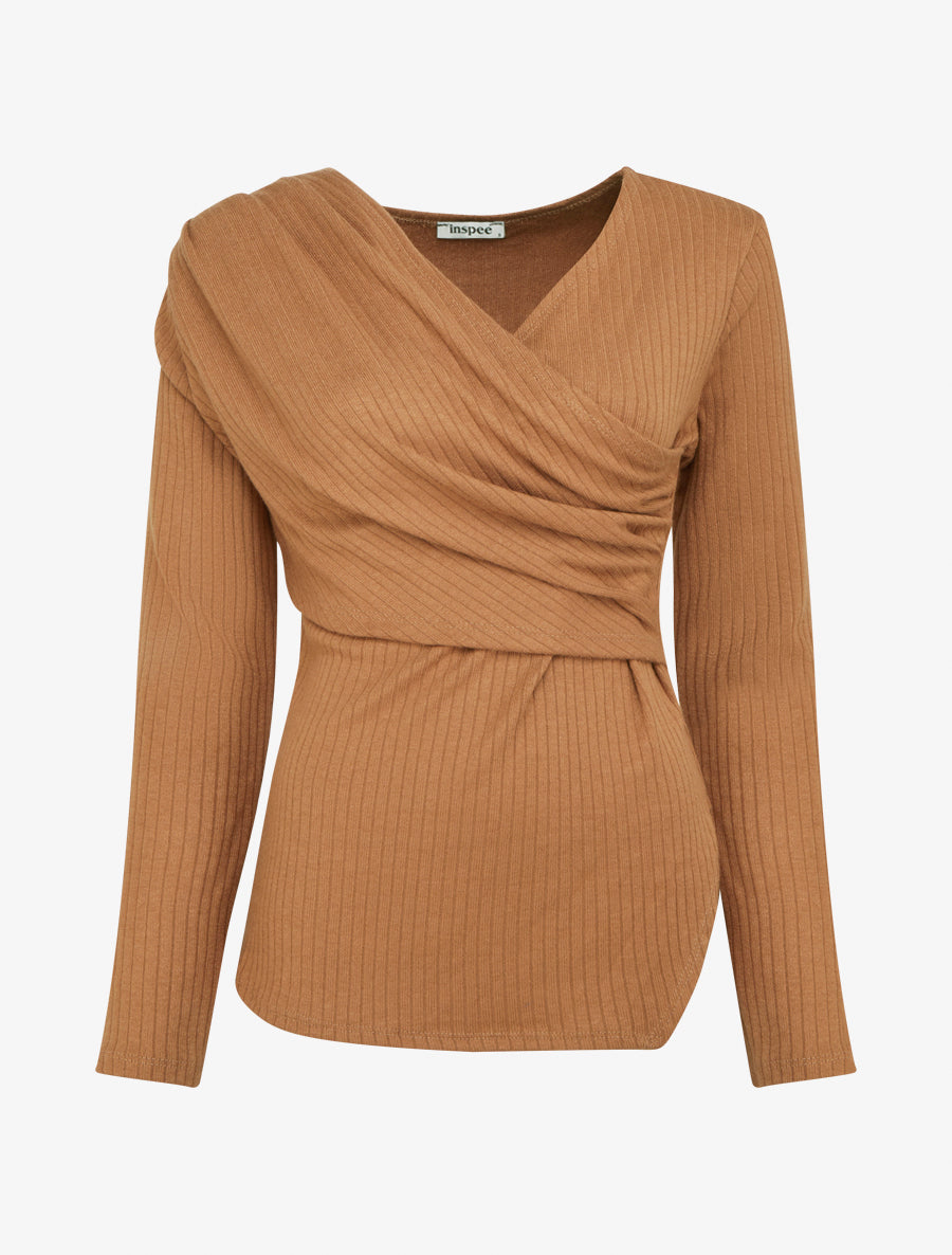 Pull fin côtelé à cache-cœur stylisé - Camel - 1