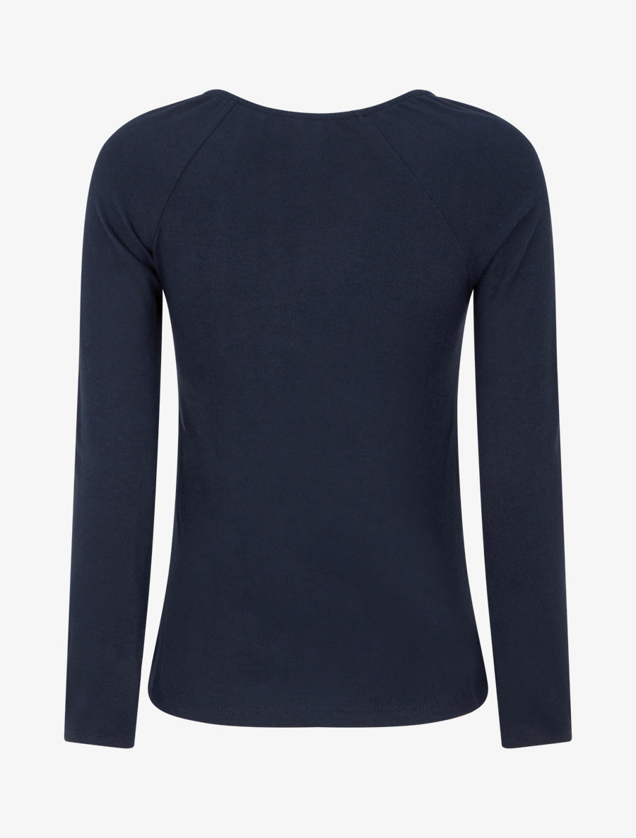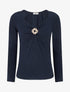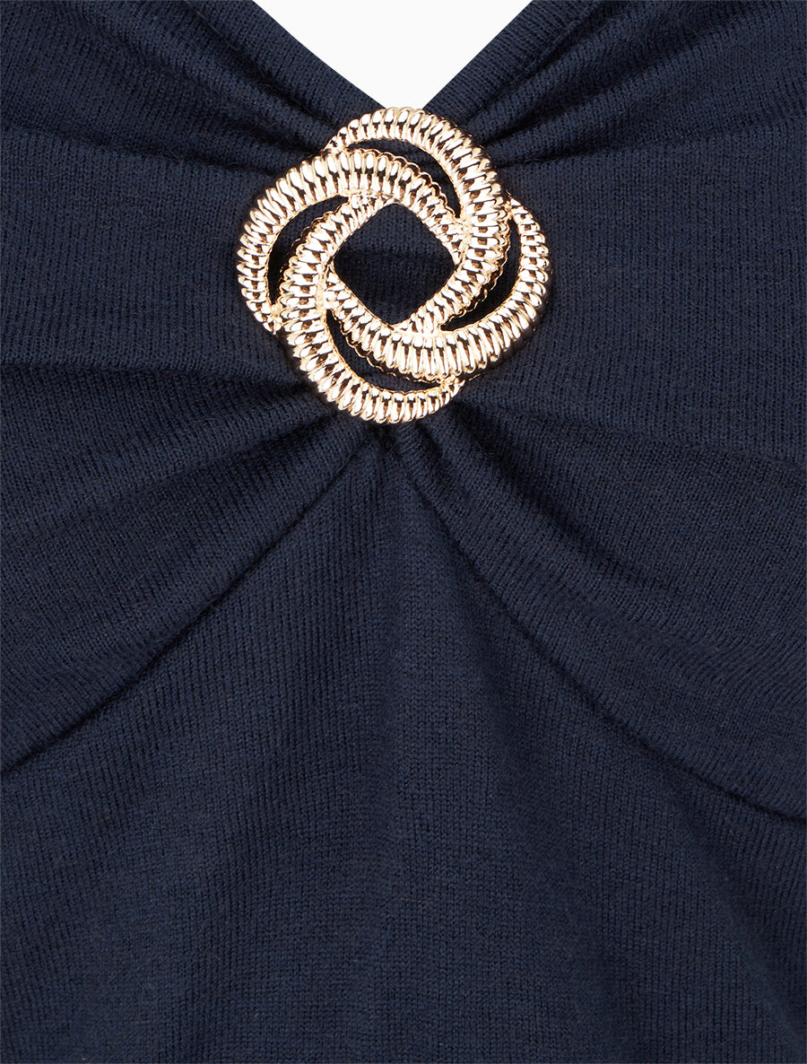 Ce pull fin marine séduit par son élégance raffinée et ses détails précieux. Sa coupe droite épouse délicatement la silhouette, tandis que l'encolure en V sublimée par un col effet froncé apporte une touche féminine. L'empiècement bijou au niveau du col affirme un style sophistiqué et contemporain. Confectionné en Italie avec un mélange de viscose, polyester et nylon, ce pull aux manches longues mesure 61 cm de longueur. Une pièce intemporelle qui s'invite aussi bien au bureau qu'en soirée, se mariant parfaitement avec un pantalon droit ou une jupe crayon.