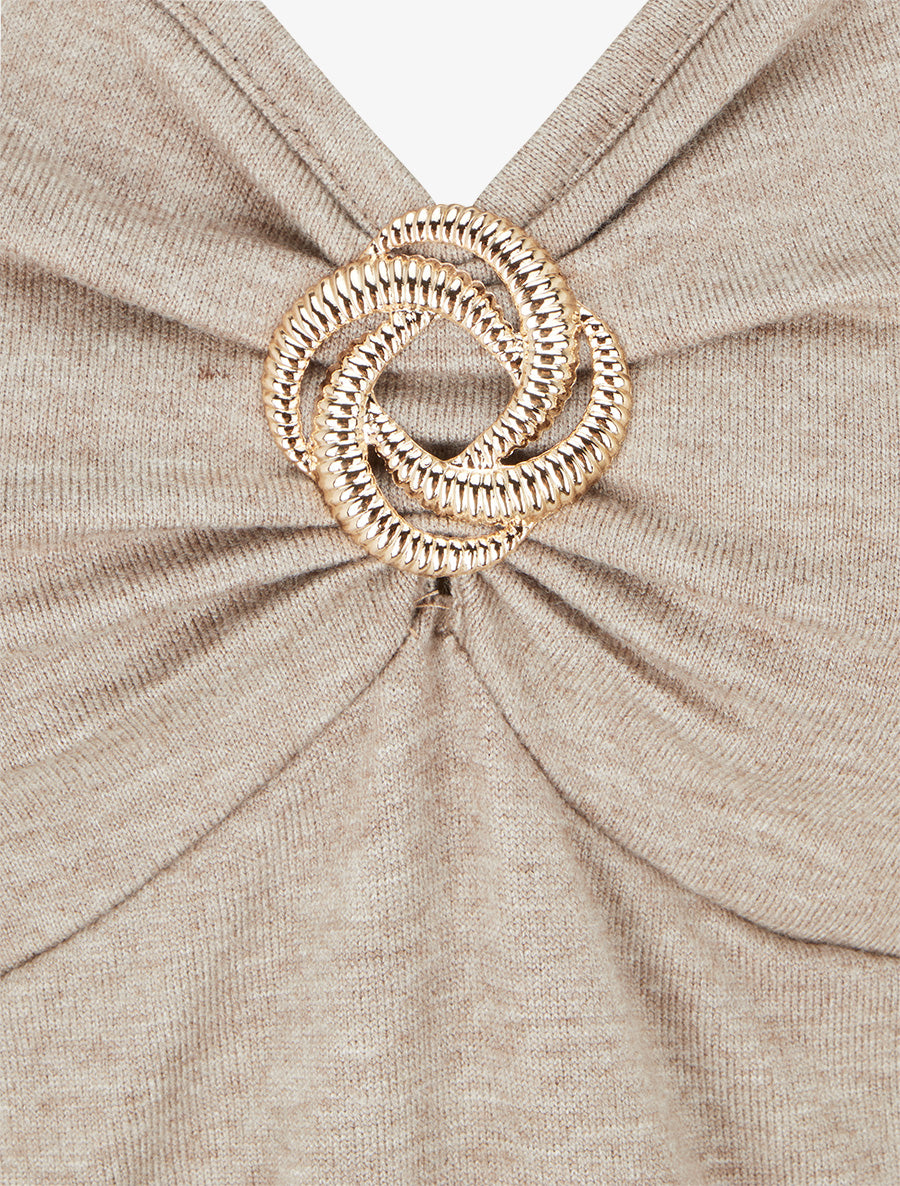 Ce pull taupe allie finesse et raffinement grâce à son tricot léger en maille unie. Son col V est sublimé par un effet froncé et un empiècement bijou qui apporte une touche précieuse. La coupe droite et les manches longues garantissent un confort optimal au quotidien. Confectionné en Italie avec un savoir-faire d'exception, ce modèle se distingue par ses détails soignés. Parfait pour composer des tenues élégantes au bureau ou lors de sorties décontractées, il se marie aisément avec un pantalon ou une jupe. Un essentiel féminin qui traverse les saisons avec style.