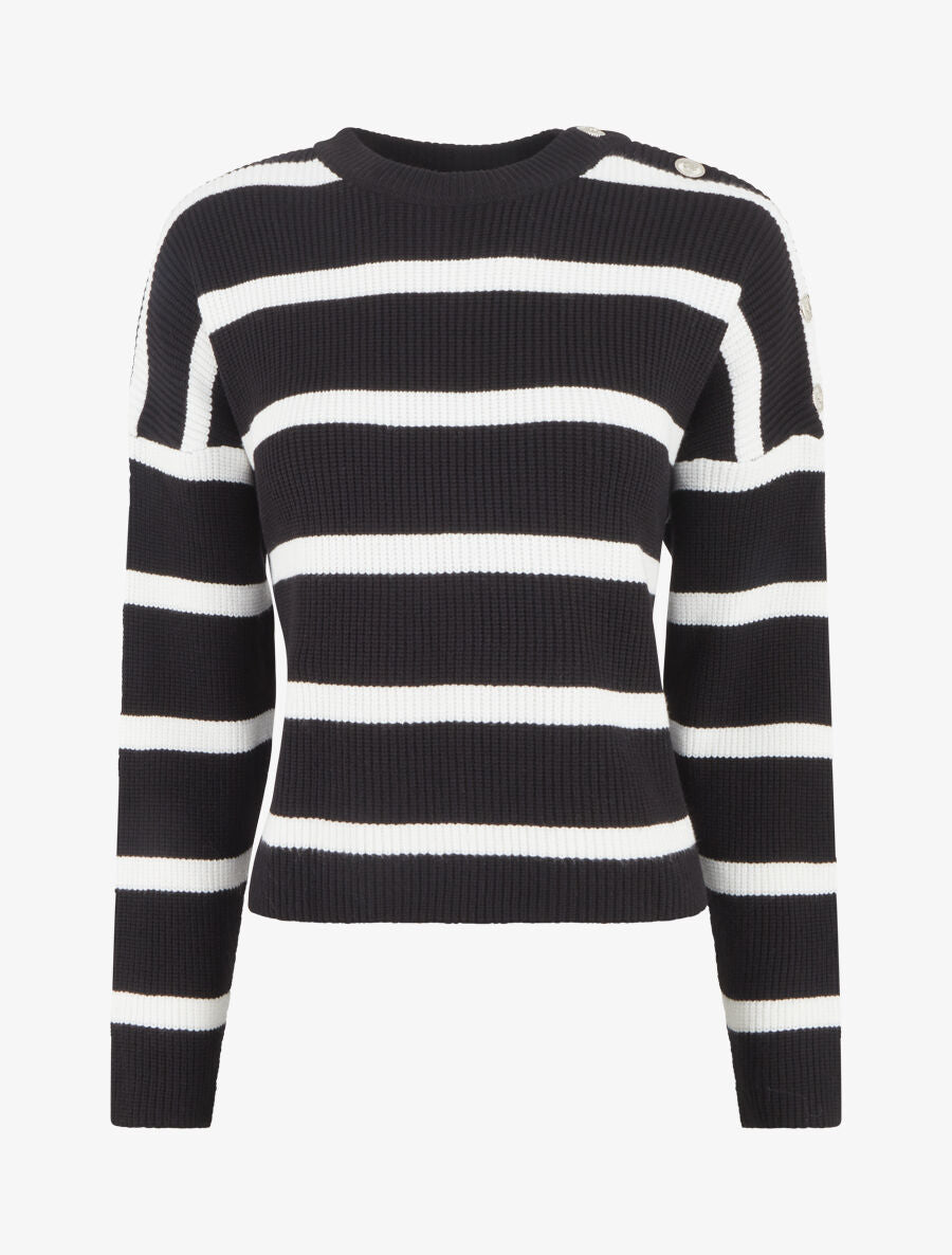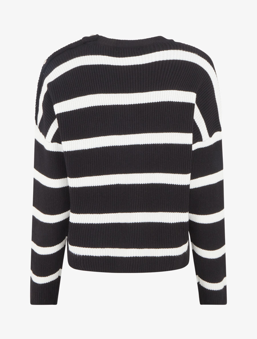 Ce pull noir à rayures affiche une coupe droite intemporelle et un col rond élégant. Ses manches longues et son imprimé rayé contrasté apportent une touche moderne à votre garde-robe. La fermeture à boutons pression à l'épaule facilite l'enfilage tout en ajoutant un détail raffiné. Sa composition en viscose, polyester et polyamide assure confort et souplesse au quotidien. Un indispensable pour composer des looks décontractés chics au bureau comme en week-end.
