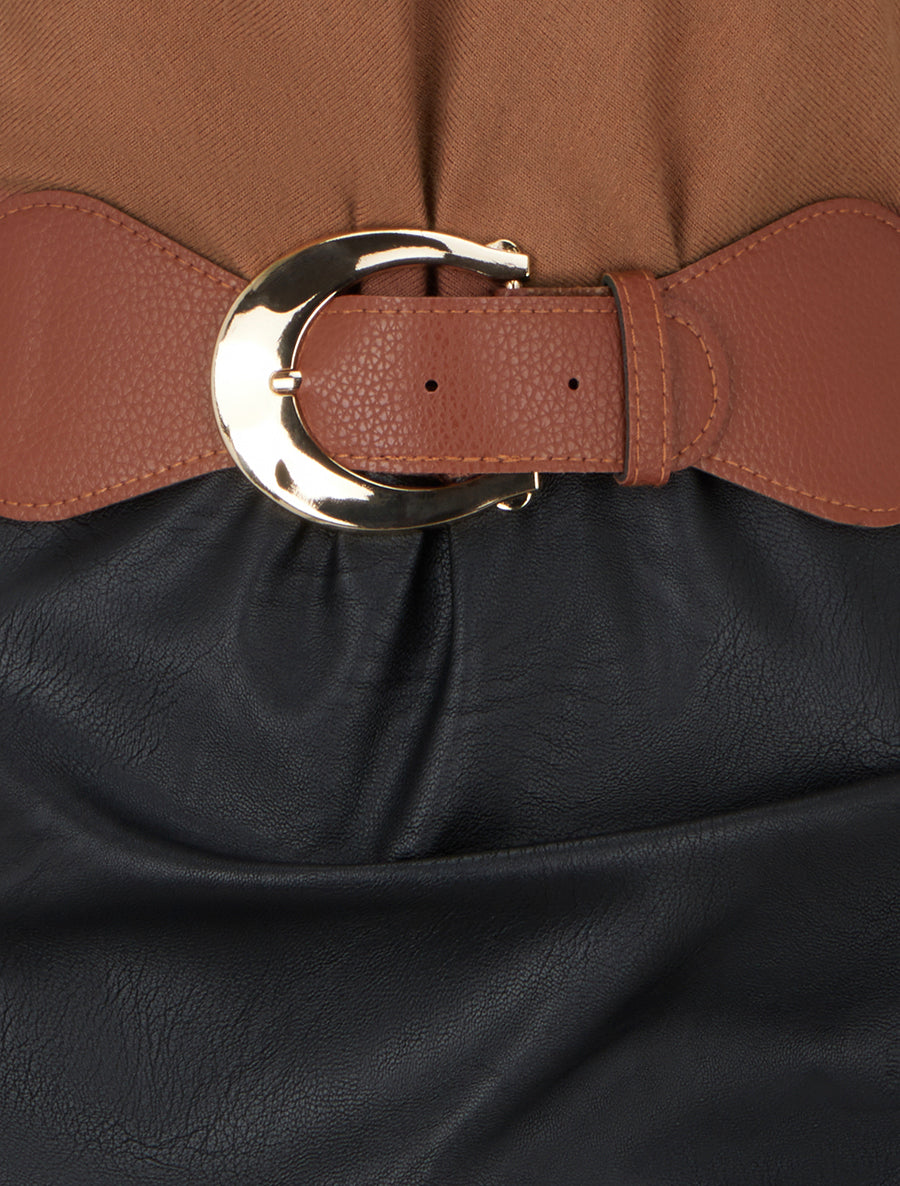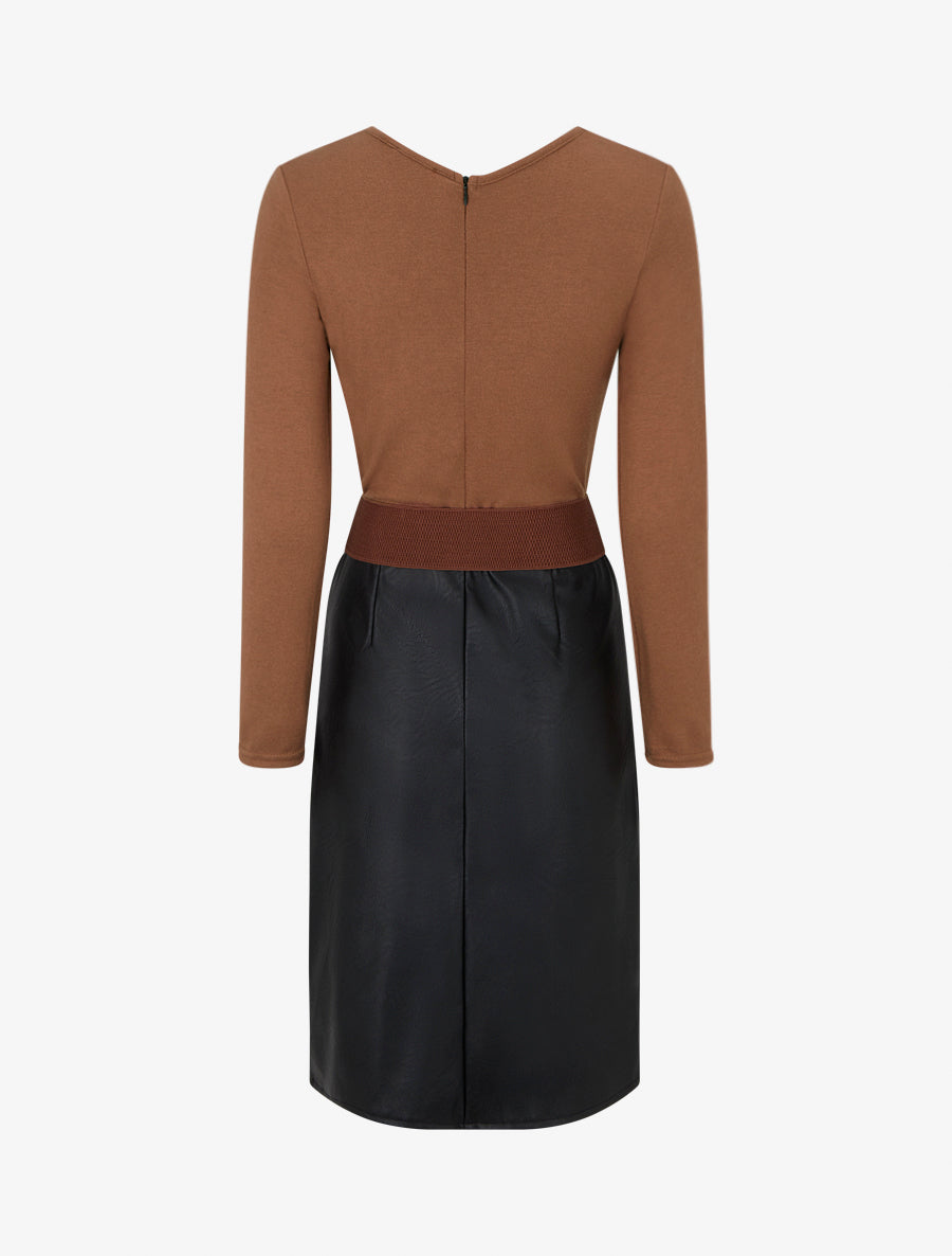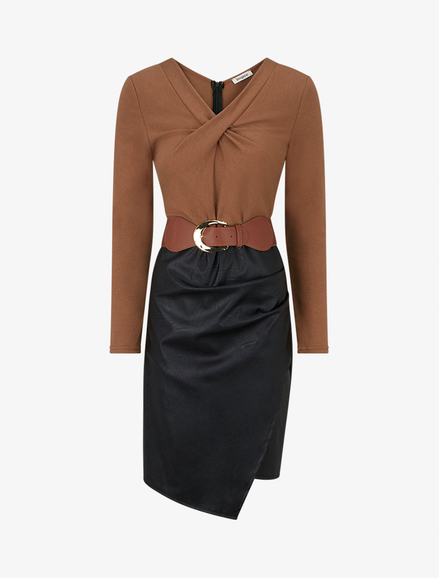 Robe bi-matière à col V froncé - Camel - 2
