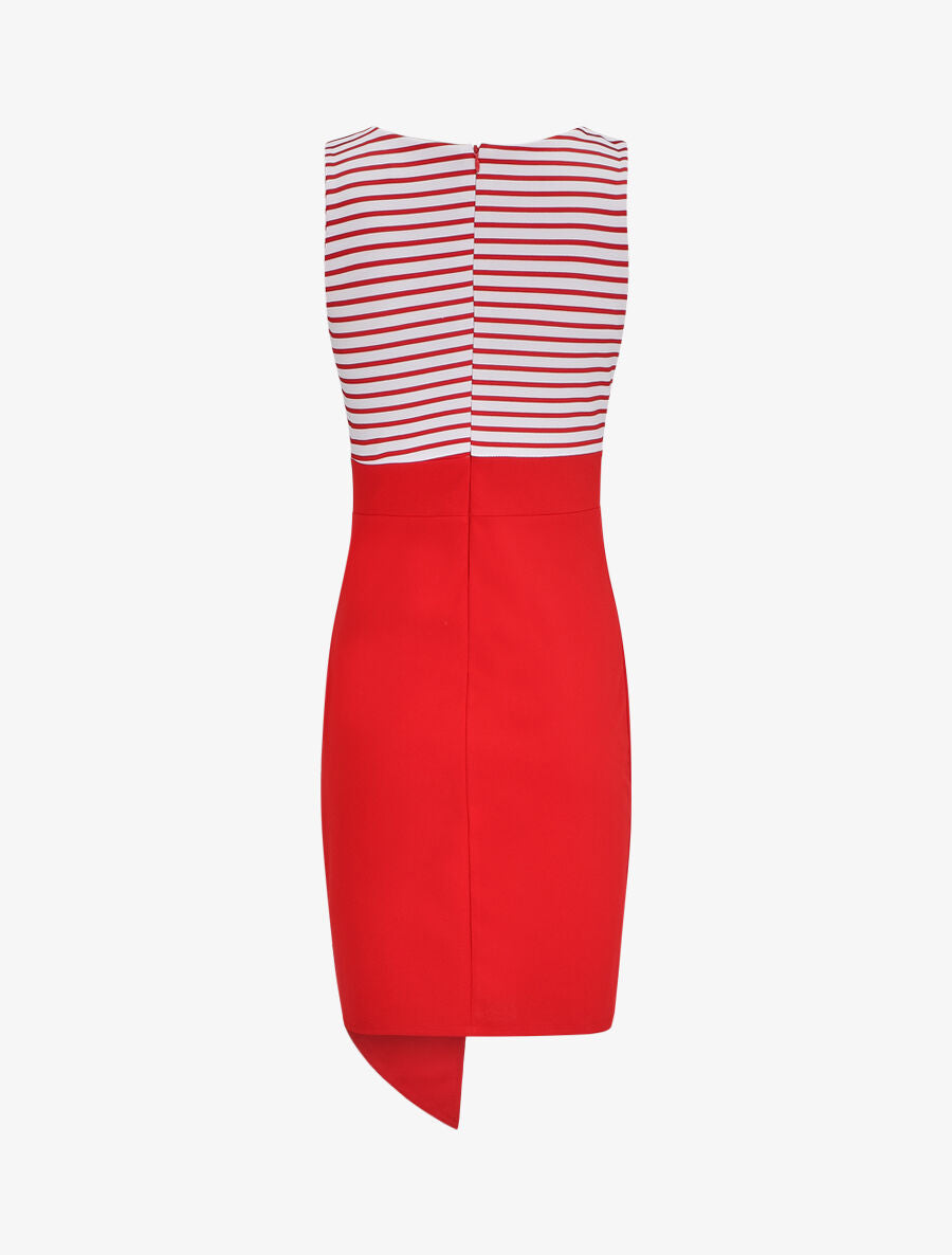 Cette robe fourreau rouge se distingue par son encolure cache-cœur sophistiquée et son imprimé rayé contrasté au buste. Les pans croisés style portefeuille sculptent élégamment la silhouette, tandis que la coupe sans manches offre une liberté de mouvement optimale. La fermeture zippée au dos assure un ajustement parfait. Confectionnée en Italie avec un mélange polyester-élasthanne, elle garantit confort et maintien tout au long de la journée. Idéale pour vos événements professionnels ou vos sorties urbaines, cette pièce incarne le raffinement à l'italienne.