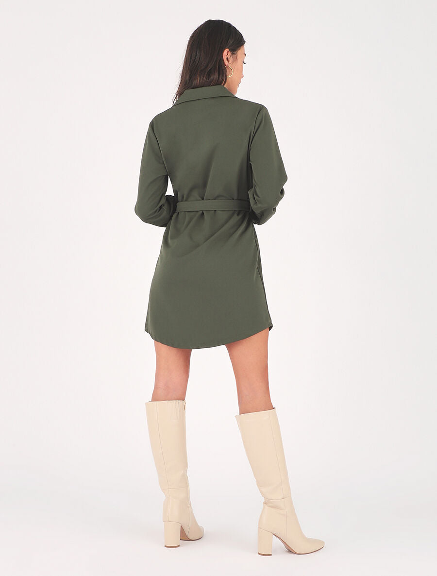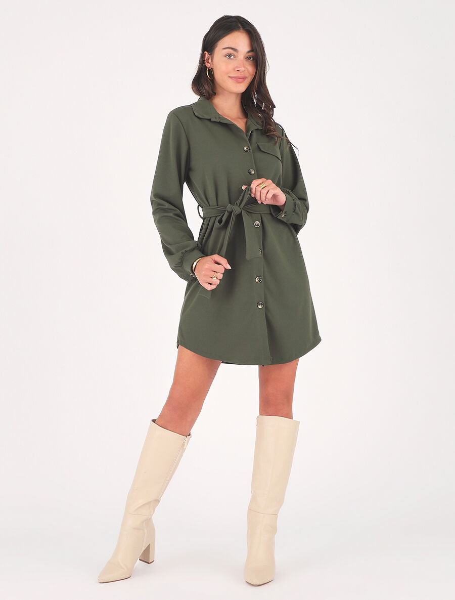 Cette robe chemise kaki allie élégance intemporelle et confort moderne. Sa coupe évasée flatte la silhouette tandis que le col à pied structure l'ensemble avec raffinement. Les manches longues à poignets boutonnés apportent une touche sophistiquée, complétées par une ceinture à nouer qui marque délicatement la taille. La fermeture boutonnée sur toute la longueur offre polyvalence et praticité. Confectionnée en Italie dans une matière stretch agréable, cette robe courte s'impose comme la pièce versatile par excellence pour vos journées actives comme vos sorties décontractées.
