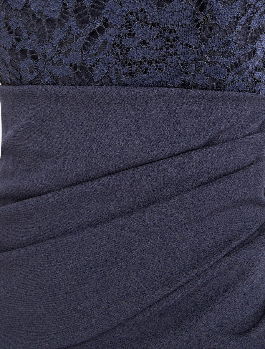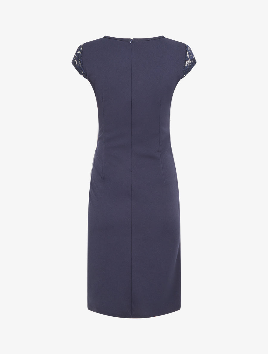 Cette robe marine allie sophistication et modernité avec son buste en dentelle raffinée et ses mancherons délicats. Sa coupe droite flatteuse se distingue par une taille effet drapé et des pans style portefeuille qui créent une silhouette élégante. Le col rond et la fermeture zippée au dos assurent un confort optimal. Confectionnée en Italie avec une composition stretch pour un tombé impeccable, cette pièce se porte aussi bien au bureau que lors d'occasions spéciales. Une création qui marie savoir-faire artisanal et design contemporain.