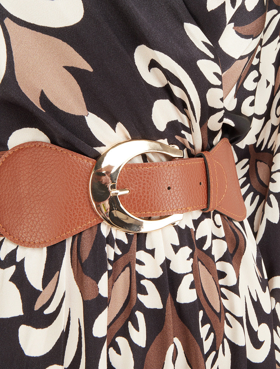 Cette robe satinée en viscose sublime votre silhouette grâce à sa coupe évasée et son encolure cache-cœur flatteuse. Les manches longues se terminent par des poignets élastiqués, tandis que la taille ajustable par élastique et ceinture incluse structure harmonieusement la silhouette. Son imprimé arabesque apporte une touche raffinée à cette création fabriquée en Italie. Facile à enfiler, elle se porte aussi bien au bureau qu'en soirée. Un modèle polyvalent qui allie confort du tissu fluide et allure sophistiquée pour toutes vos occasions.