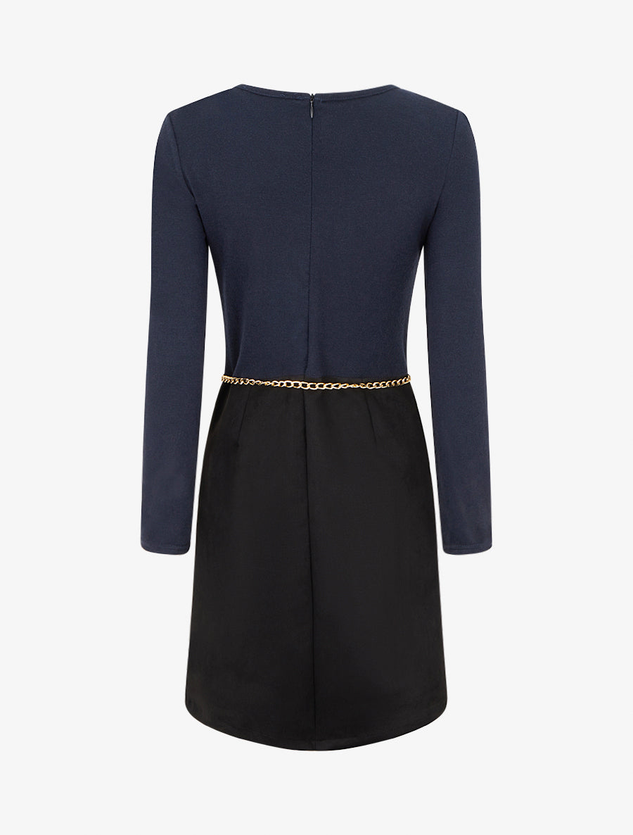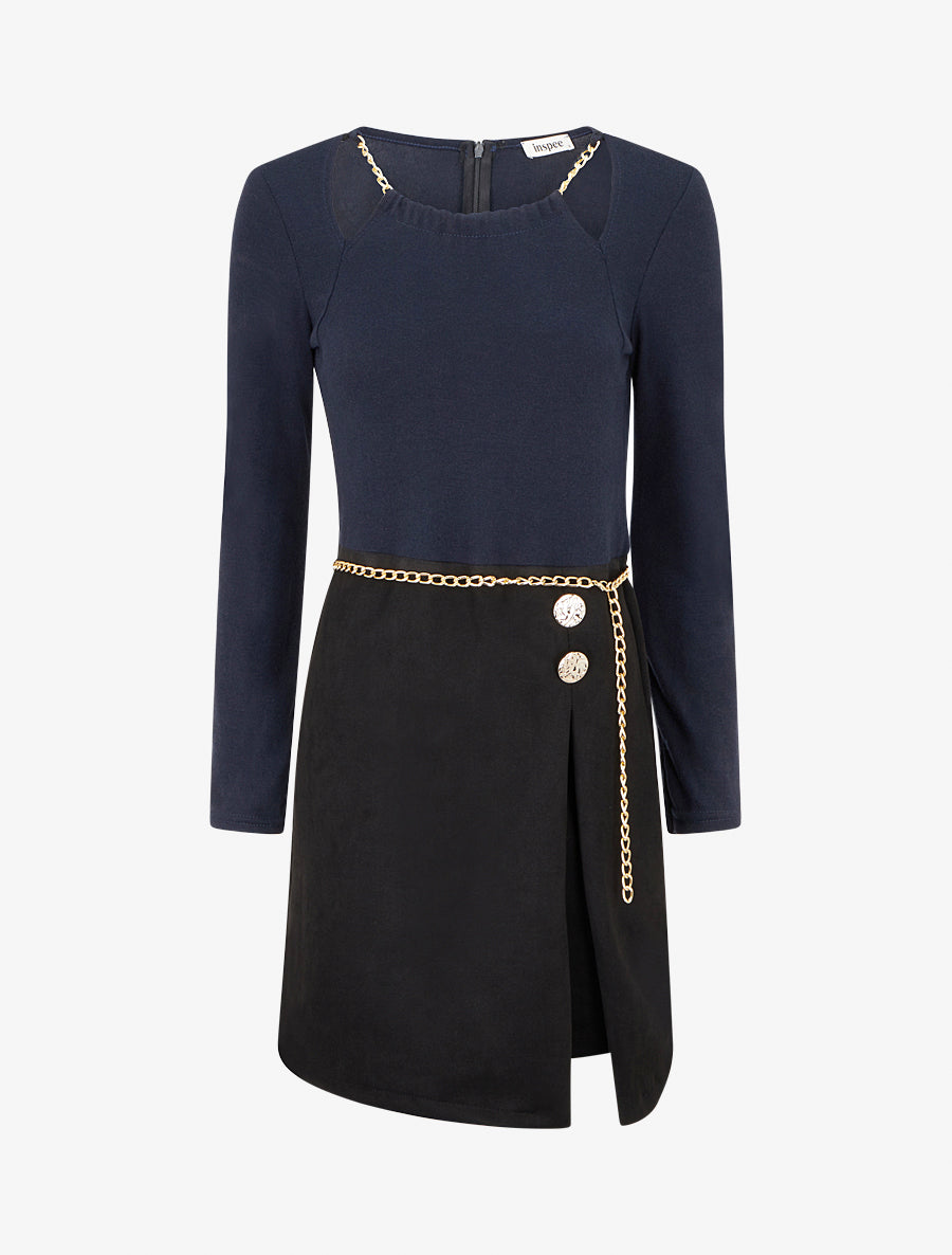 Robe droite col chaînes et fente suédine - Bleu nuit