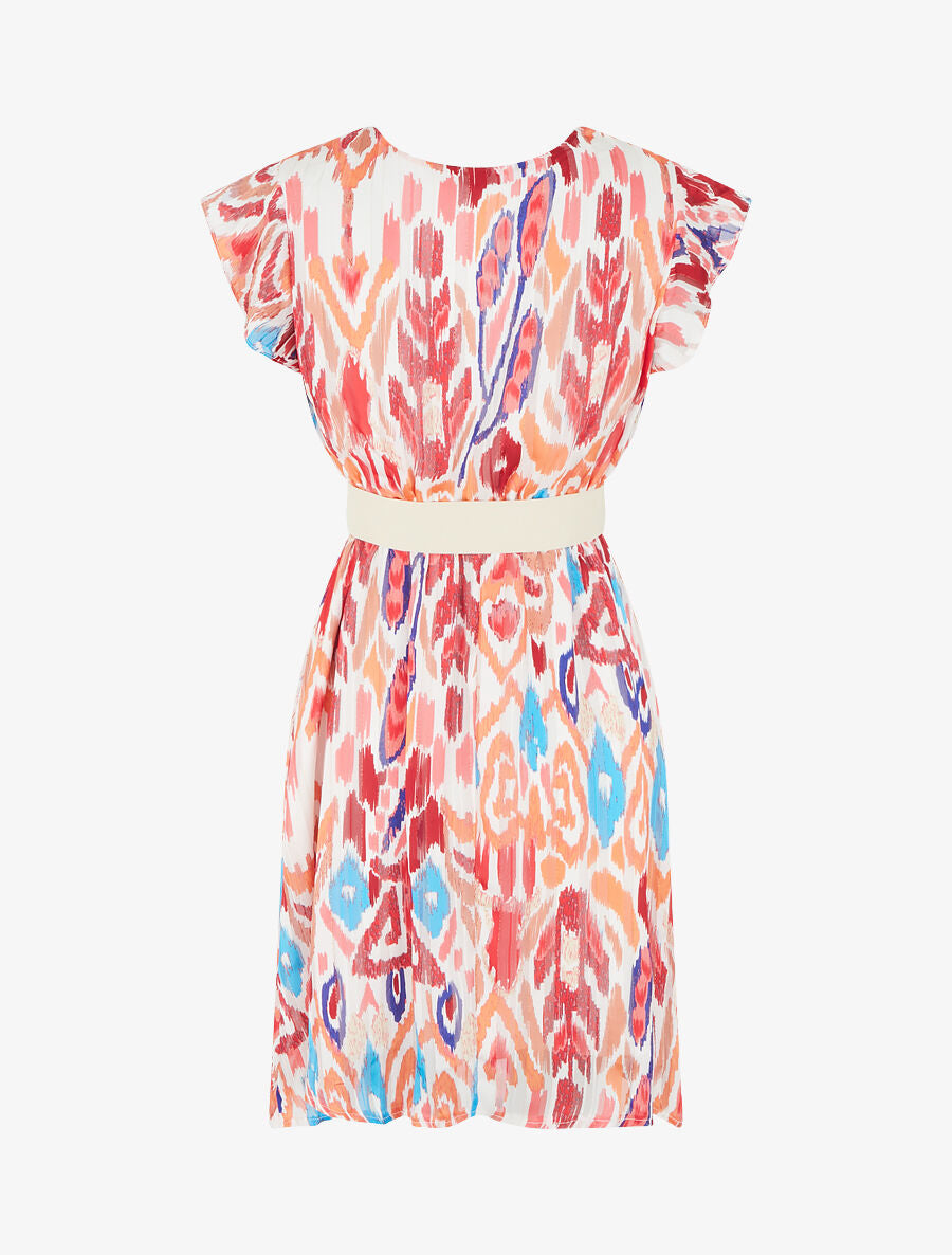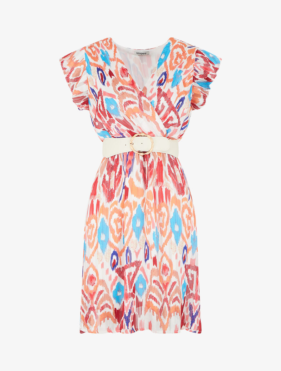 Succombez au charme de cette robe coupe empire à l'imprimé abstrait irisé qui capte la lumière avec raffinesse. Son encolure cache-cœur flatteuse et ses manches courtes volantées apportent une touche féminine irrésistible. La taille élastiquée assure un confort optimal tout au long de la journée, tandis que la doublure garantit une tenue impeccable. Livrée avec une ceinture amovible pour ajuster votre silhouette selon vos envies. Facile à enfiler, cette robe de 88 cm se porte aussi bien au bureau qu'en soirée estivale.