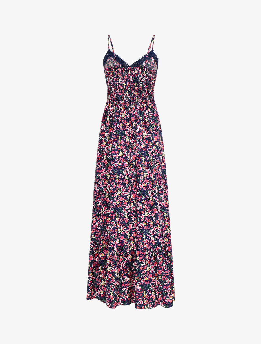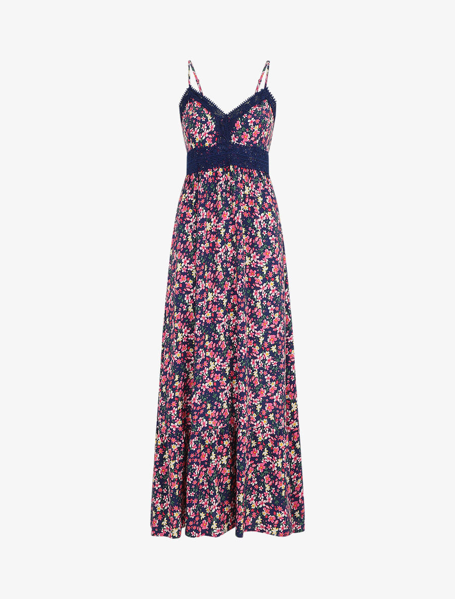 Robe longue à col dentelle et imprimé multi-fleurs - Marine - 1