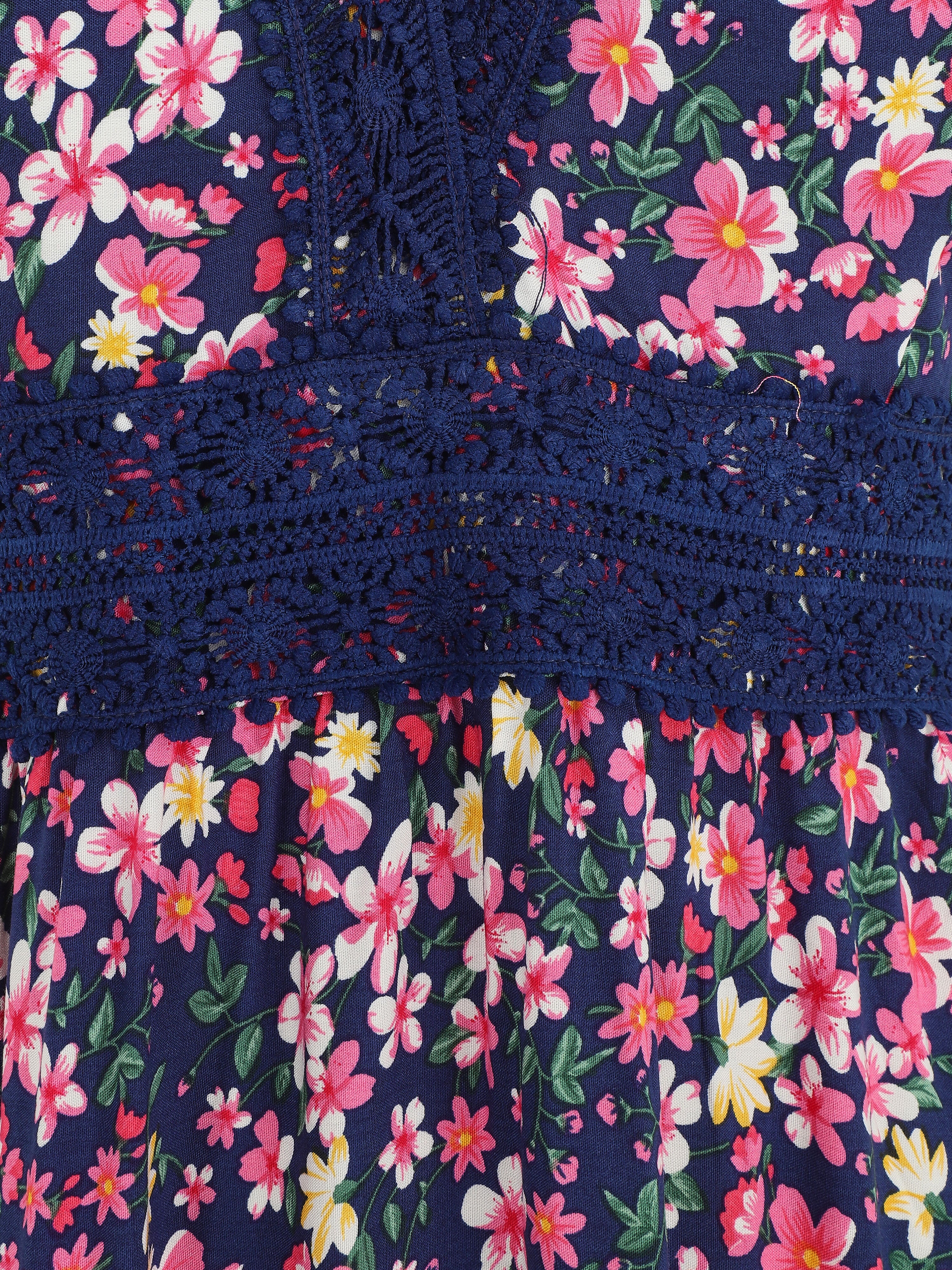 Succombez au charme romantique de cette robe longue à imprimé multi-fleurs sur fond marine. Sa coupe empire flatteuse sublime la silhouette, tandis que l'encolure en V délicatement ornée de dentelle apporte une touche raffinée. Les fines bretelles ajustables garantissent un maintien optimal et personnalisé. Le dos et la taille élastiqués ornés de dentelle assurent confort et aisance tout au long de la journée. Confectionnée en viscose fluide, cette robe à enfiler se porte idéalement lors de vos sorties estivales, garden-parties ou escapades en bord de mer. Un modèle polyvalent qui marie féminité et décontraction avec élégance naturelle.