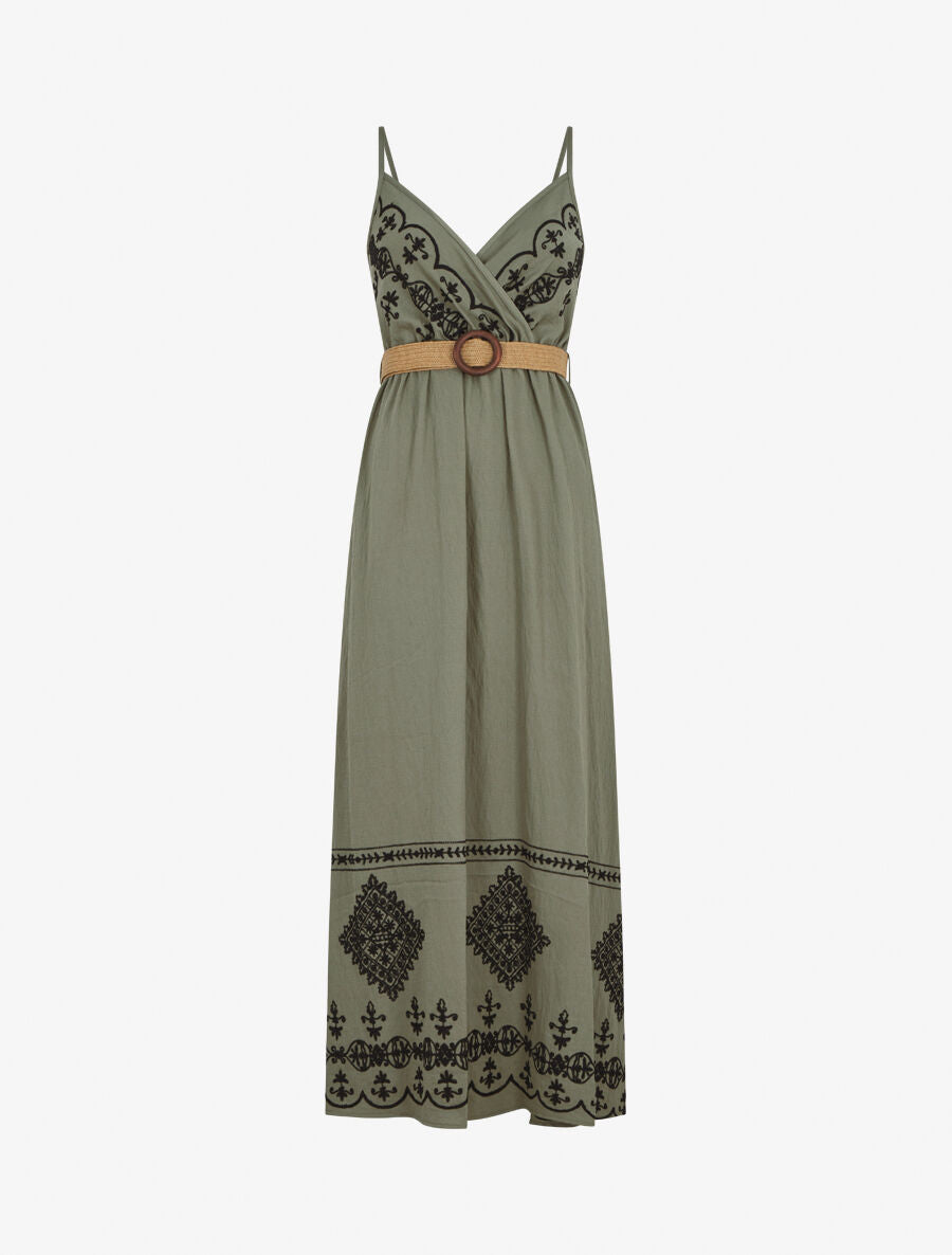 Robe longue à fines bretelles et broderies - Kaki - 2