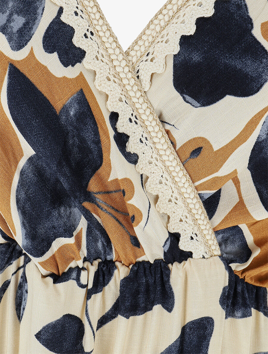 Succombez au charme de cette robe longue coupe empire qui sublime votre silhouette. Son encolure cache-cœur rehaussée d'une broderie irisée apporte une touche raffinée, tandis que ses fines bretelles ajustables garantissent un ajustement parfait. L'imprimé feuillage marine évoque l'élégance naturelle, sublimé par une taille élastiquée confortable. Confectionnée en viscose fluide avec doublure, cette robe assure un tombé impeccable pour toutes vos occasions estivales. Un essentiel polyvalent qui traverse les saisons avec style.