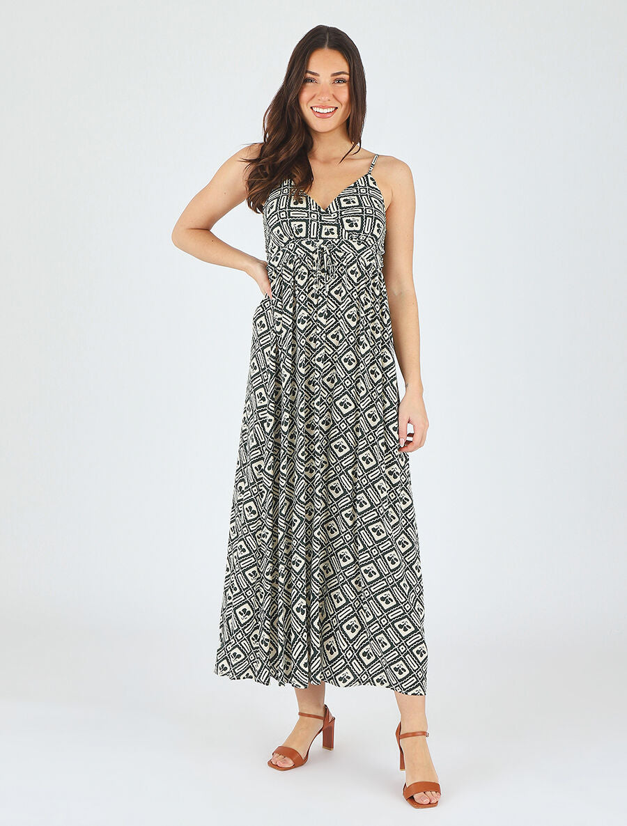 Succombez au charme de cette robe longue à l'imprimé graphique captivant. Sa coupe empire sublime la silhouette tandis que l'encolure cache-cœur apporte une touche féminine et raffinée. Les fines bretelles ajustables garantissent un ajustement personnalisé pour un confort optimal. Les liens à nouer ajoutent une note bohème élégante. Confectionnée en viscose fluide, cette robe à enfiler se porte idéalement lors de vos sorties estivales ou événements décontractés. Un modèle polyvalent qui marie style et praticité avec brio.