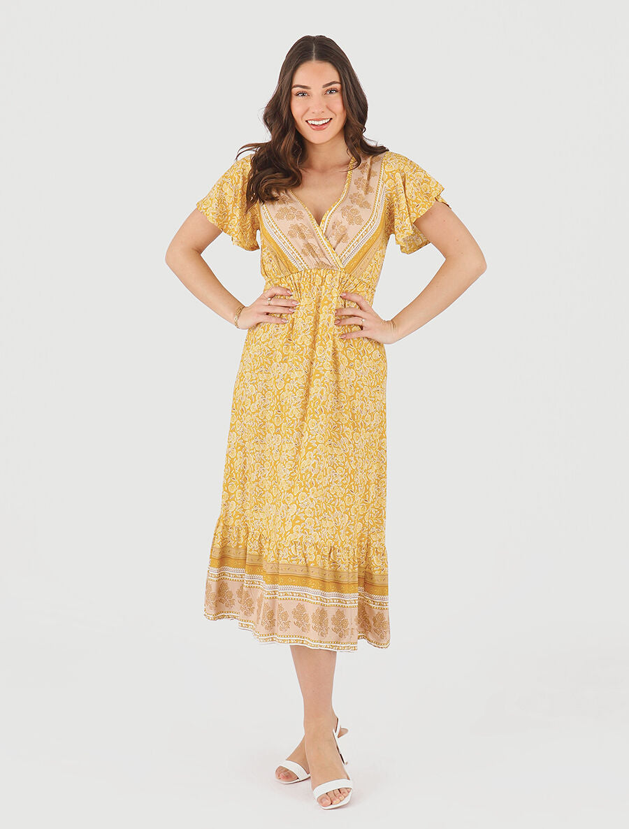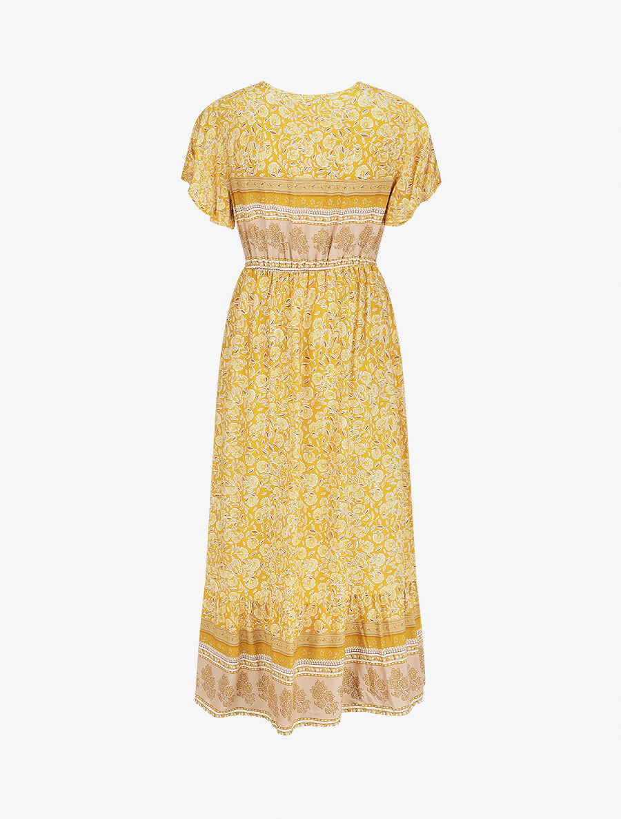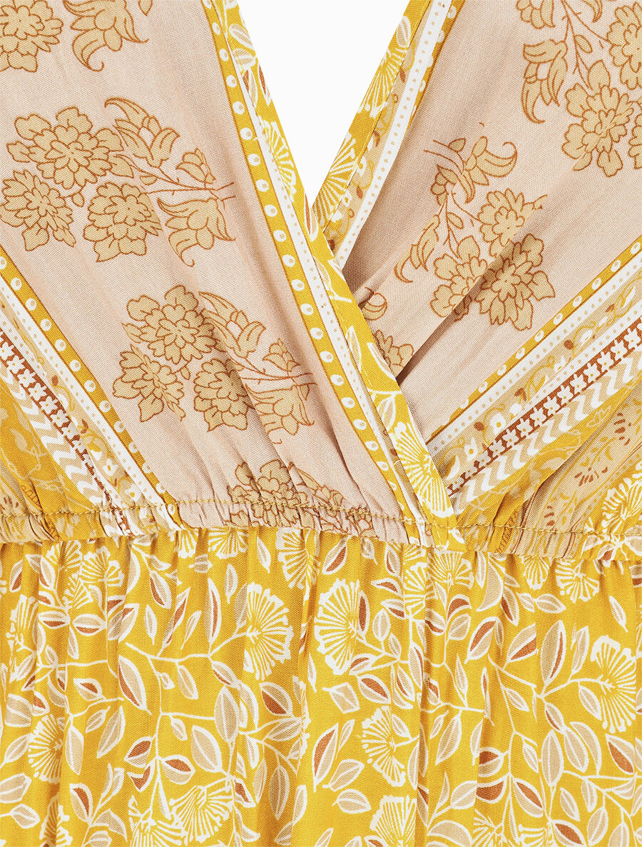 Robe longue cache-cœur fleurie volantée - Jaune