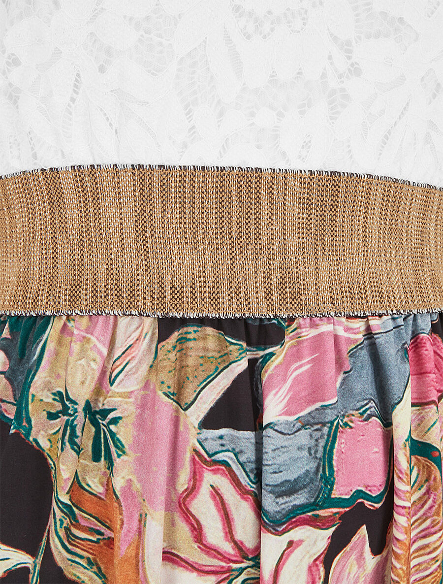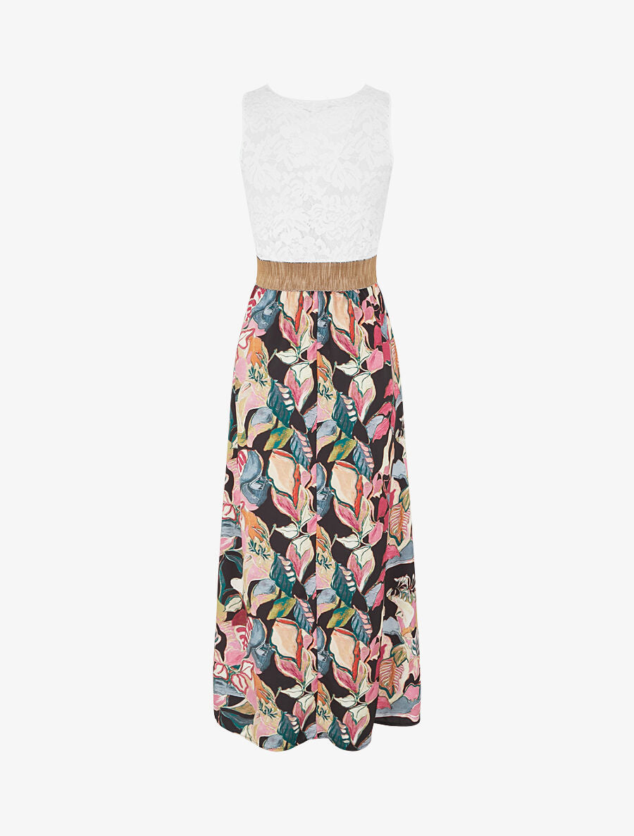 Craquez pour cette robe longue au charme sophistiqué, alliant un bustier en dentelle raffinée et un imprimé feuillage captivant. Sa coupe droite et son encolure V subliment la silhouette avec élégance. Sans manches et facile à enfiler, elle offre un confort optimal tout en restant féminine. Confectionnée en Italie avec soin, cette pièce bi-matière s'impose comme l'alliée parfaite de vos soirées estivales et événements spéciaux. Un modèle intemporel qui associe délicatesse et modernité pour un style affirmé.
