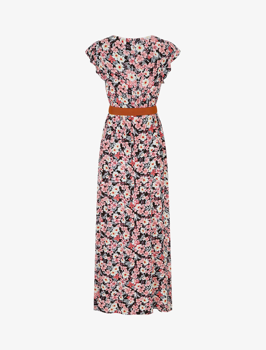 Robe longue imprimé fleuri à manches volantées - Noir - 4