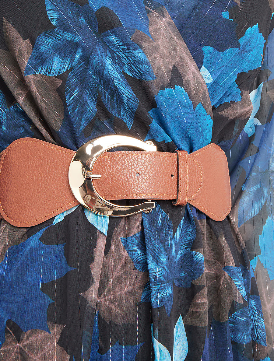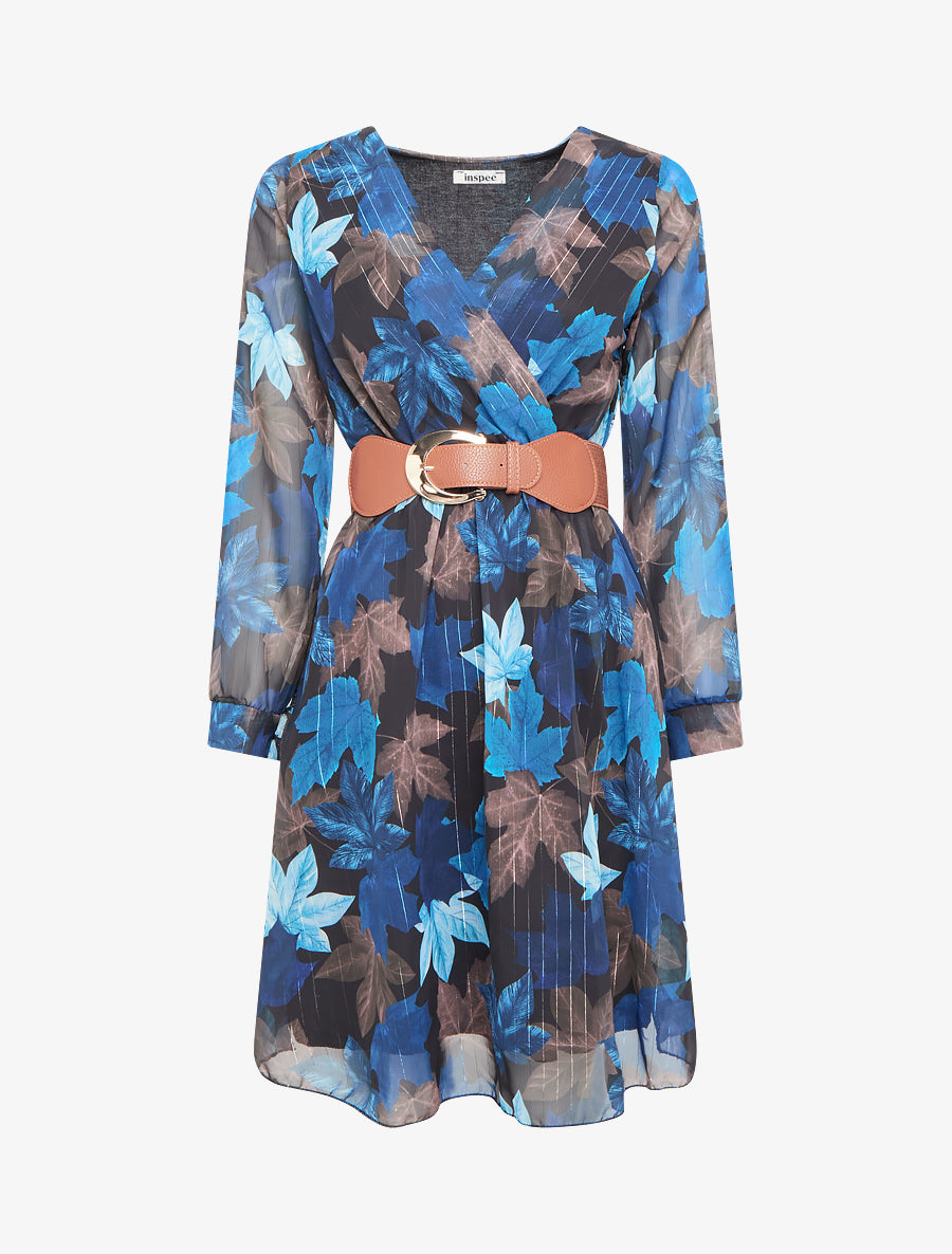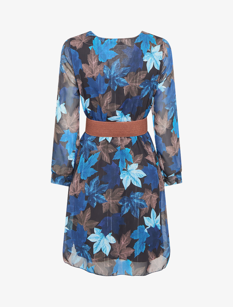 Robe mi-longue évasée imprimé feuilles - Marine - 1