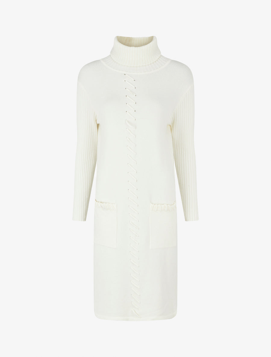 Cette robe pull mi-longue séduit par sa coupe droite intemporelle et son col roulé protecteur. Confectionnée dans un mélange doux de viscose, polyester et polyamide, elle affiche un style décontracté avec ses manches longues et ses deux poches plaquées pratiques. Les coutures apparentes apportent une touche moderne à cette pièce à enfiler facilement. Parfaite pour composer des looks confortables au quotidien, elle se porte aussi bien au bureau qu'en week-end. Une silhouette féminine et épurée qui traverse les saisons avec élégance.
