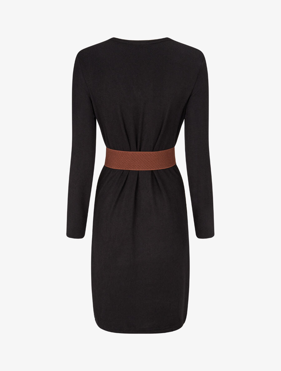Cette robe pull noire allie confort et originalité grâce à son empiècement élastiqué imprimé fantaisie irisé qui capte la lumière. Sa coupe droite et son col V créent une silhouette épurée et moderne. Confectionnée en Italie, elle se distingue par ses manches longues et sa ceinture incluse pour marquer la taille selon vos envies. Fabriquée dans un mélange doux de viscose, polyester et nylon, cette robe garantit un porter agréable tout au long de la journée. Parfaite pour vos journées décontractées comme pour vos sorties urbaines, elle s'adapte à toutes vos occasions avec style.