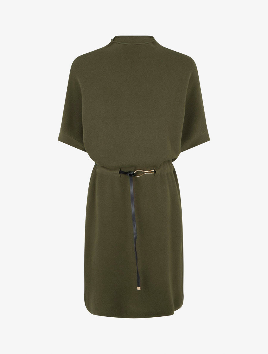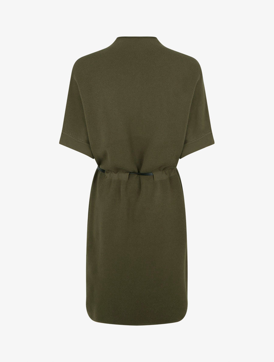 Adoptez cette robe pull kaki à la coupe droite et intemporelle. Son encolure montante apporte une touche sophistiquée, tandis que ses manches courtes offrent un équilibre parfait entre confort et style. La ceinture incluse permet de marquer la taille et d'ajuster la silhouette selon vos envies. Confectionnée dans un mélange de viscose, modal et élasthanne, cette robe à enfiler garantit une aisance optimale tout au long de la journée. Idéale pour vos sorties décontractées comme pour le bureau, elle se porte avec des bottines ou des baskets selon l'occasion.