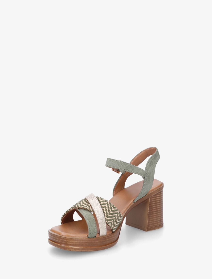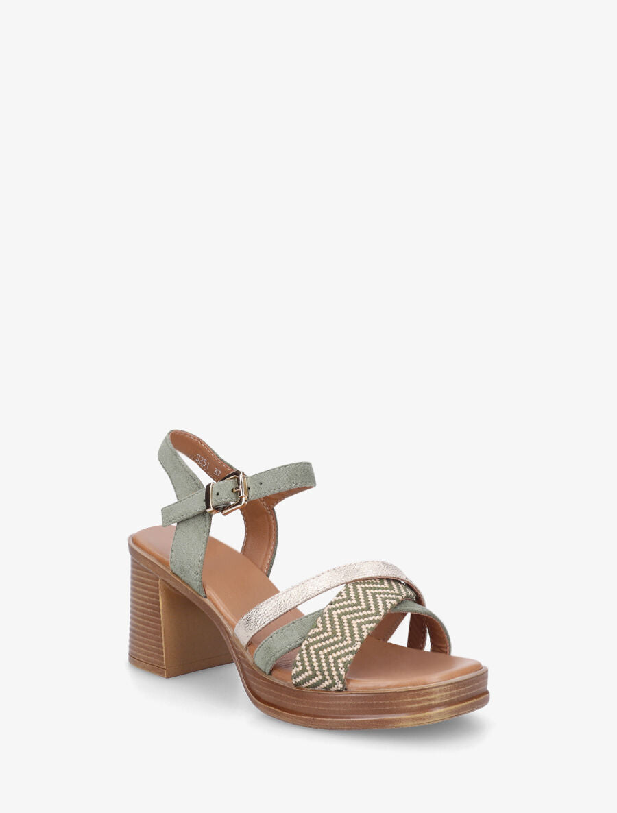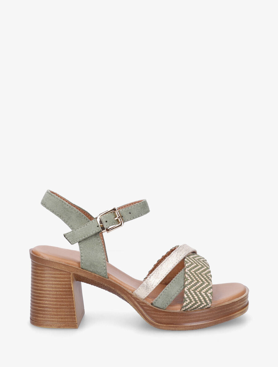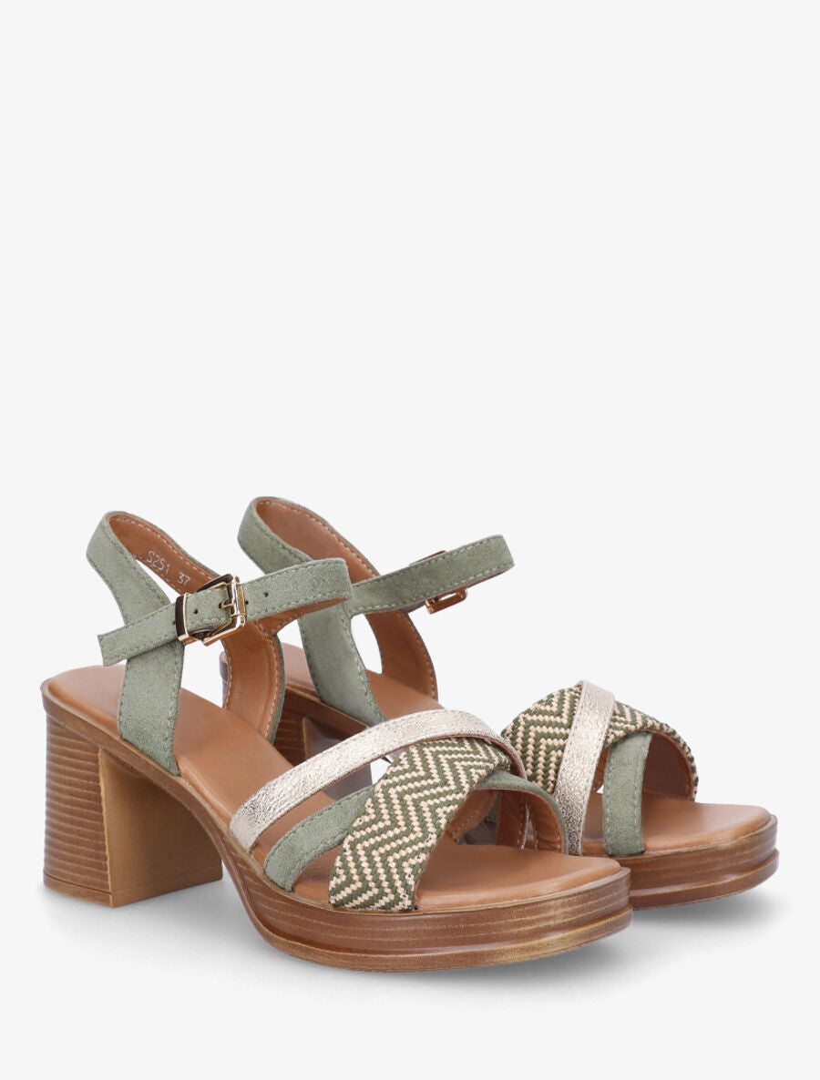 Craquez pour ces sandales kaki qui allient confort et modernité avec leur talon bloc de 7 cm à effet bois et plateforme stabilisante. Le design graphique à losanges et les brides irisées apportent une touche contemporaine, tandis que la bride à boucle dorée autour de la cheville assure un maintien optimal. Leur structure en simili et suédine offre un rendu élégant pour toutes vos sorties estivales. Les bouts ouverts garantissent une sensation de légèreté, parfaites pour accompagner vos tenues décontractées comme habillées lors des beaux jours.