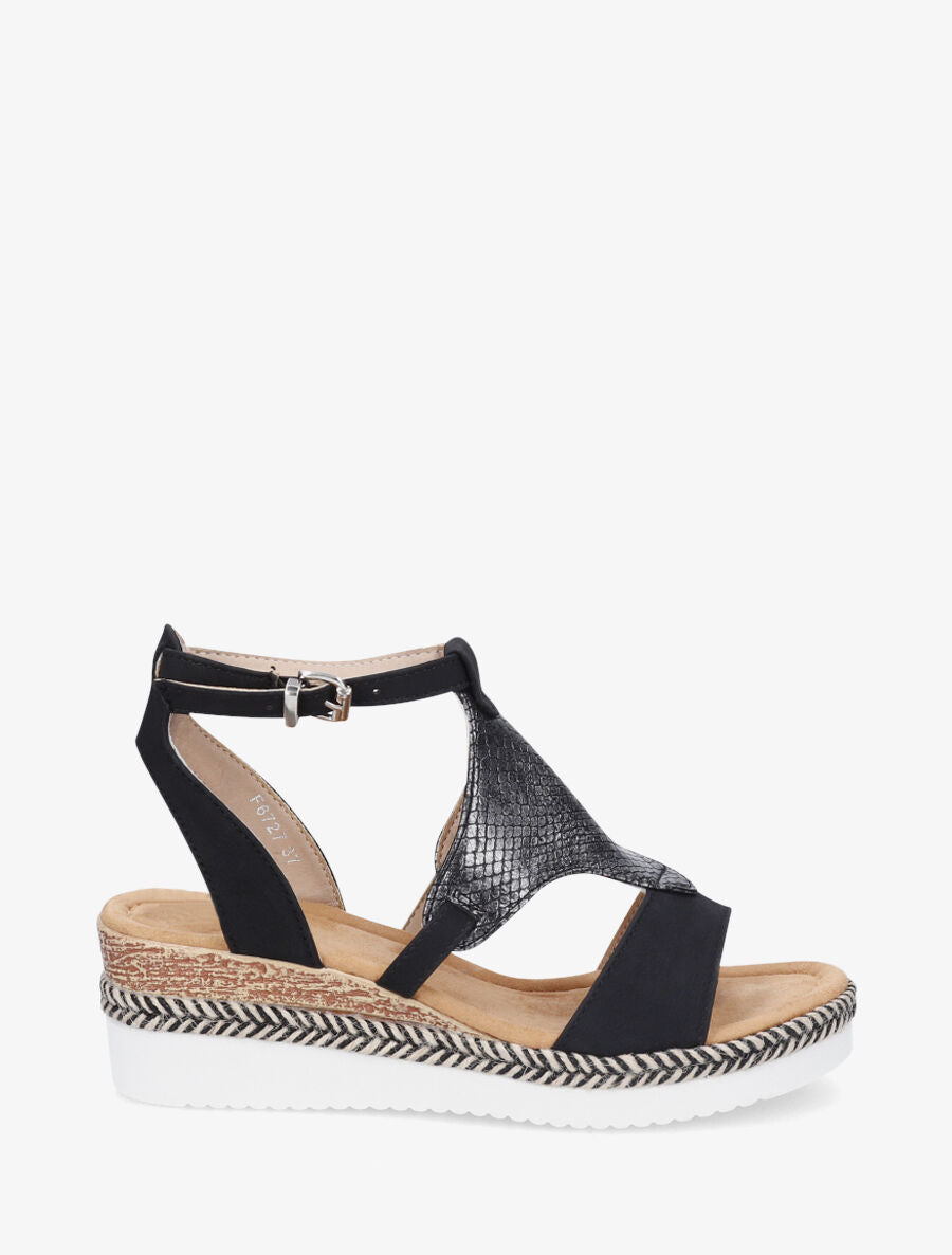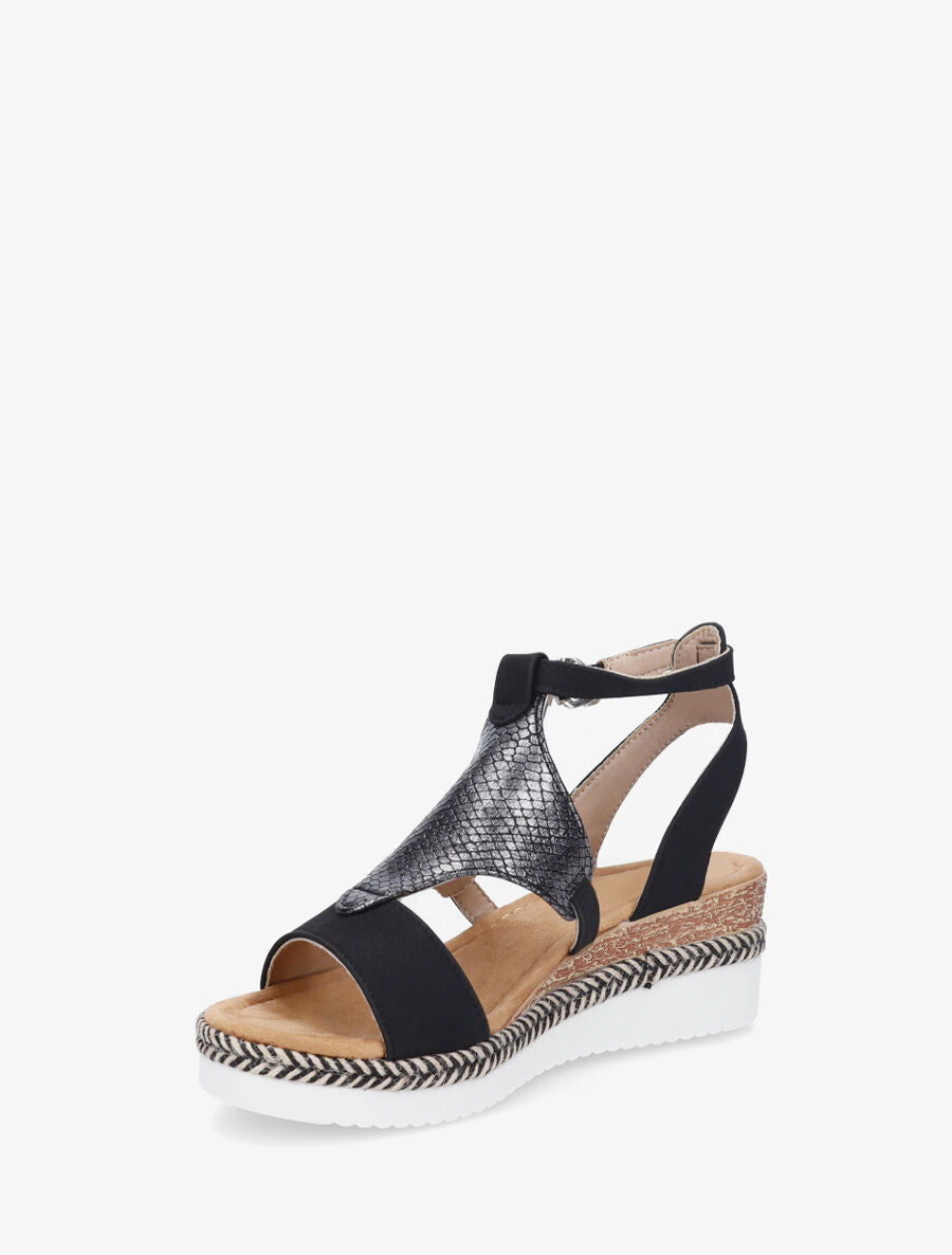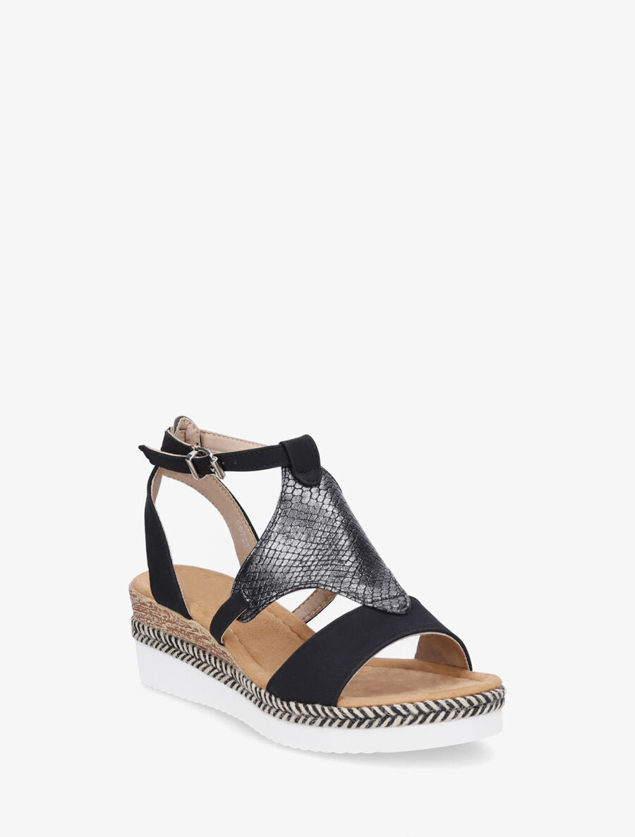 Ces sandales compensées allient confort et sophistication avec leur talon de 5,5 cm habillé d'une élégante tresse en raphia. Le simili effet nubuck noir contraste subtilement avec la ganse effet python irisé qui apporte une touche moderne et graphique. La bride à boucle au tour de cheville assure un maintien optimal tandis que les bouts ouverts garantissent une allure estivale. Parfaites pour sublimer vos tenues décontractées comme vos looks plus habillés, elles s'adaptent à toutes vos occasions ensoleillées avec style et aisance.