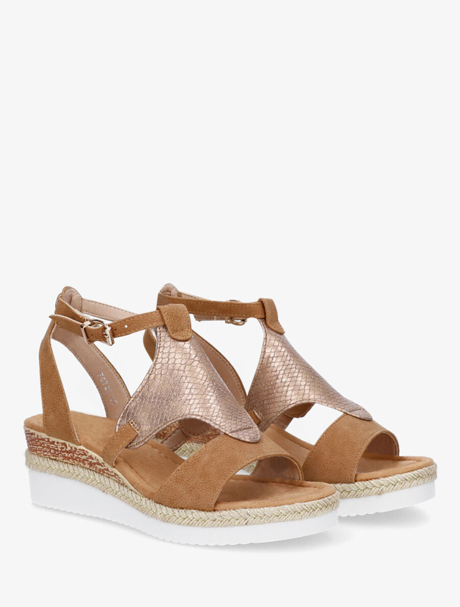 Sublimez vos tenues estivales avec ces sandales compensées en simili effet nubuck camel. Leur talon compensé de 5,5 cm orné d'une élégante tresse en raphia apporte une touche naturelle et raffinée. La ganse effet python irisé ajoute une note sophistiquée, tandis que la bride à boucle au tour de cheville assure un maintien optimal. Leurs bouts ouverts garantissent confort et légèreté. Parfaites pour vos sorties ensoleillées, du brunch entre amis aux promenades en ville, elles s'accordent idéalement avec robes fluides et pantalons légers.