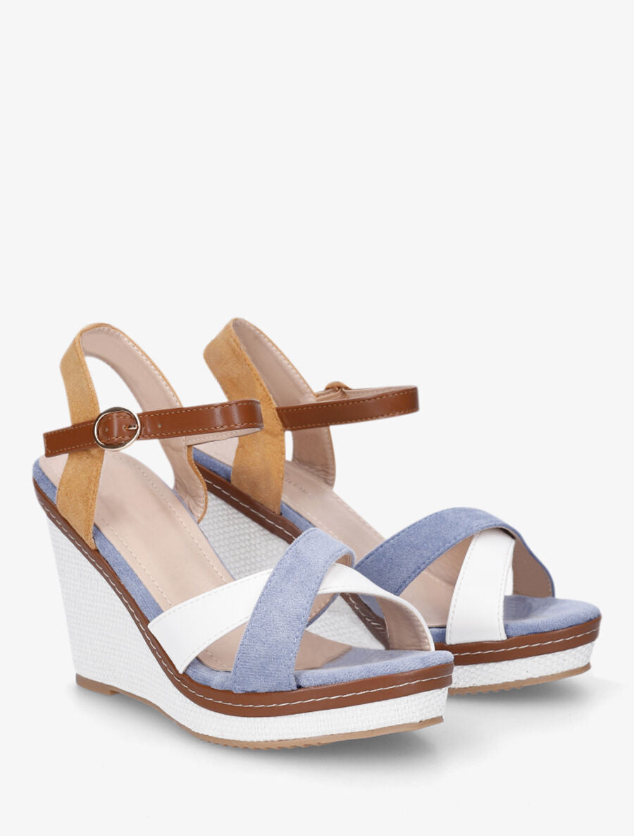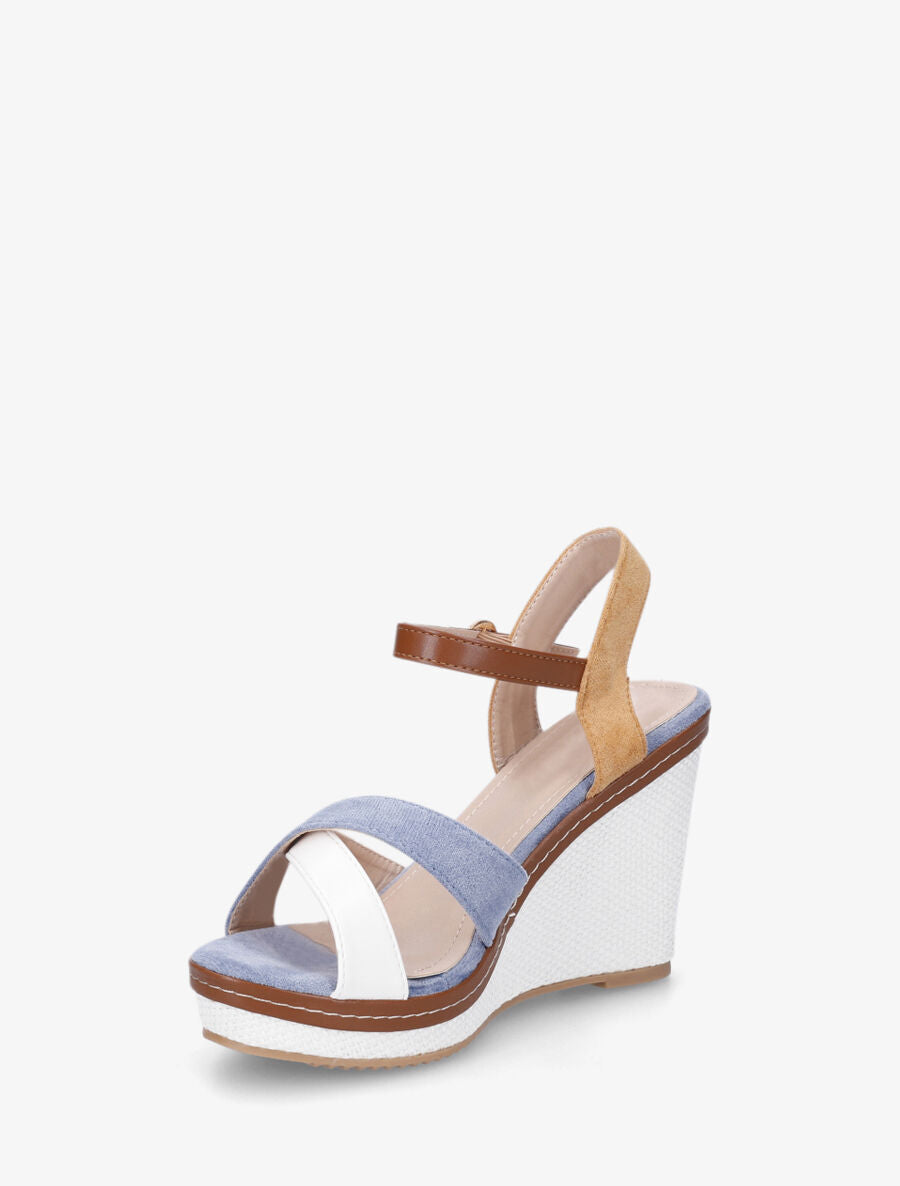Découvrez ces sandales compensées qui allient style et confort avec élégance. Leur semelle compensée de 9 cm à effet panier d'osier apporte une touche estivale raffinée. Les brides croisées en simili et suédine structurent le pied avec modernité, tandis que la bride à boucle au tour de cheville assure un maintien optimal. Leurs bouts ouverts garantissent une aération parfaite. Idéales pour vos sorties ensoleillées ou vos événements estivaux, ces sandales bicolores s'accordent avec robes fluides et pantalons légers. Un modèle polyvalent qui rehausse votre silhouette tout en préservant votre confort.