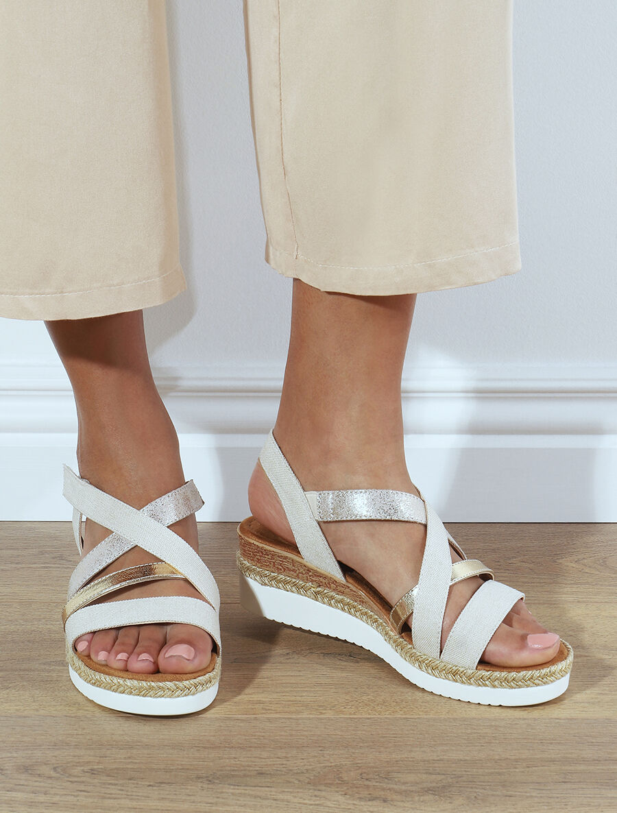 Ces sandales compensées en simili cuir associent confort et style estival. Leur talon compensé de 5 cm assure une élégance naturelle tout en garantissant une stabilité optimale. Les brides entrelacées apportent une touche stylisée et moderne, tandis que la fermeture à scratch au niveau de la cheville permet un ajustement personnalisé. Leur bout ouvert et leur teinte beige intemporelle en font un choix idéal pour accompagner vos tenues estivales avec raffinement et décontraction.