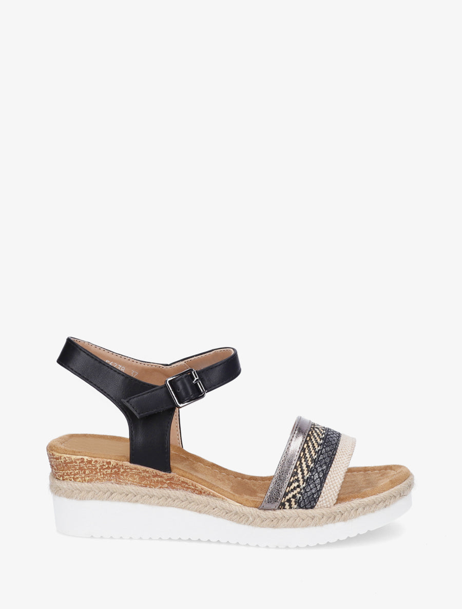 Ces sandales compensées en simili cuir noir allient confort et style estival. Leur semelle compensée de 5,5 cm, ornée d'une élégante tresse en raphia, apporte une touche naturelle et authentique. Les brides texturées offrent un design raffiné, tandis que la bride à boucle au tour de cheville assure un maintien optimal. Avec leurs bouts ouverts, elles garantissent une aération idéale pour vos journées ensoleillées. Parfaites pour accompagner une robe d'été ou un pantalon léger, ces sandales compensées deviennent l'atout mode de votre garde-robe estivale. Leur hauteur modérée garantit confort et stabilité tout au long de la journée.