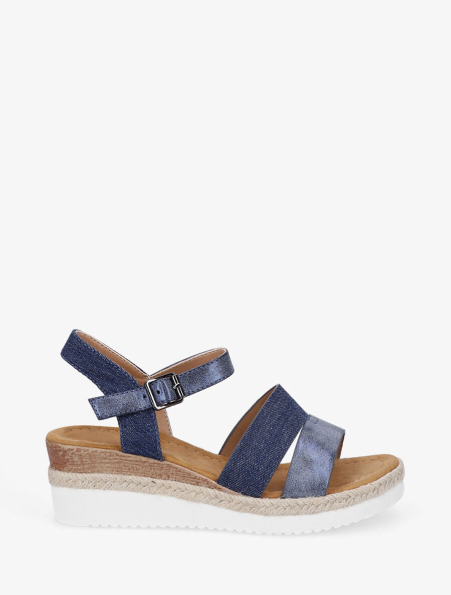 Ces sandales compensées captivent par leur finition irisée qui joue avec la lumière à chaque mouvement. Le talon compensé de 5,5 cm orné d'une élégante tresse apporte une touche artisanale raffinée. La bride à boucle autour de la cheville assure un maintien optimal, tandis que les doubles brides subliment le dessus du pied. Les bouts ouverts en simili et tissu garantissent confort et respirabilité. Parfaites pour vos sorties estivales ou événements décontractés, elles allient style contemporain et praticité au quotidien.