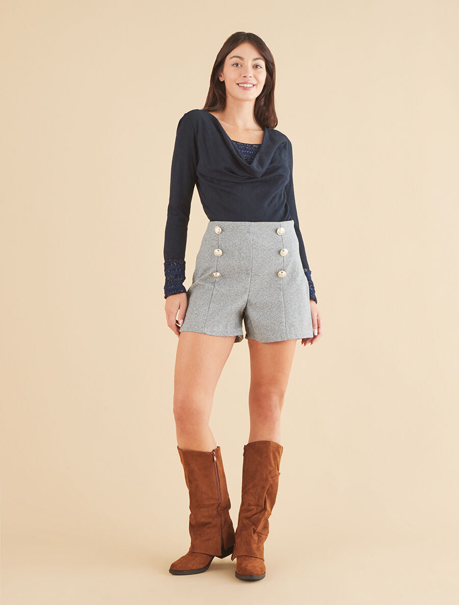 Ce short en tweed sophistiqué se distingue par sa taille haute flatteuse et sa fermeture zippée latérale discrète. Les boutons décoratifs apportent une touche raffinée à cette pièce confectionnée en Italie. Sa coupe ajustée valorise la silhouette avec élégance. Parfait pour composer des tenues professionnelles modernes ou des looks décontractés chics, ce short en tweed s'associe aussi bien avec un chemisier qu'avec un pull fin. Une pièce polyvalente qui traverse les saisons avec style et assurance.