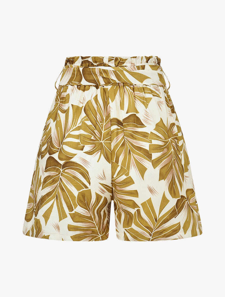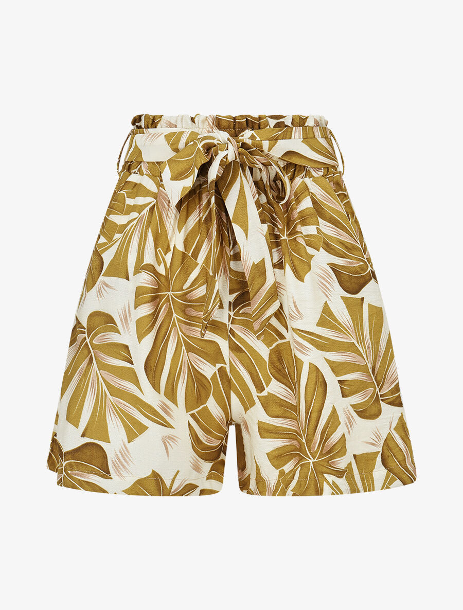 Adoptez l'esprit vacances avec ce short paper bag orné d'un imprimé feuilles tropicales. Sa coupe droite et sa taille haute élastiquée garantissent un confort optimal tout au long de la journée. Doté de deux poches pratiques et d'une ceinture à nouer, ce modèle à enfiler se distingue par son style décontracté et estival. La viscose fluide assure une texture agréable et une allure décontractée. Parfait pour vos sorties ensoleillées, ce short jaune ocre apporte une touche d'exotisme à votre garde-robe estivale tout en conservant une élégance naturelle.