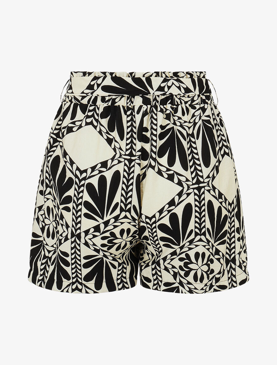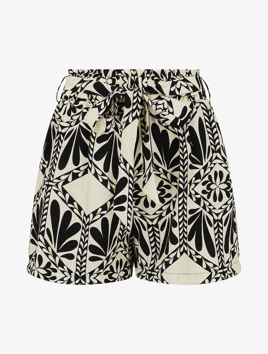 Adoptez l'élégance décontractée avec ce short paper bag à imprimé ikat graphique. Sa coupe droite et sa taille haute élastiquée offrent un confort optimal tout en structurant la silhouette. Les deux poches latérales apportent une touche pratique à ce modèle facile à enfiler. Son motif ikat noir sophistiqué s'associe facilement à vos hauts favoris pour créer des looks estivaux raffinés. Parfait pour vos journées ensoleillées comme pour vos soirées d'été, ce short en viscose fluide devient rapidement une pièce incontournable de votre garde-robe.