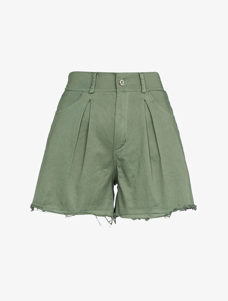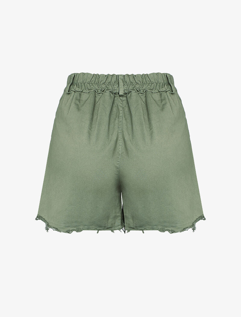 Ce short kaki à coupe trapèze séduit par son style décontracté et moderne. Sa taille haute froncée affine la silhouette tandis que ses bords effilochés apportent une touche tendance et authentique. Doté de deux poches pratiques et d'une fermeture zippée avec bouton, il combine confort et fonctionnalité. Confectionné en Italie dans un tissu stretch agréable à porter, ce short s'impose comme la pièce idéale pour vos journées ensoleillées. Son coloris kaki intemporel se marie facilement avec vos hauts favoris pour un look décontracté-chic réussi.