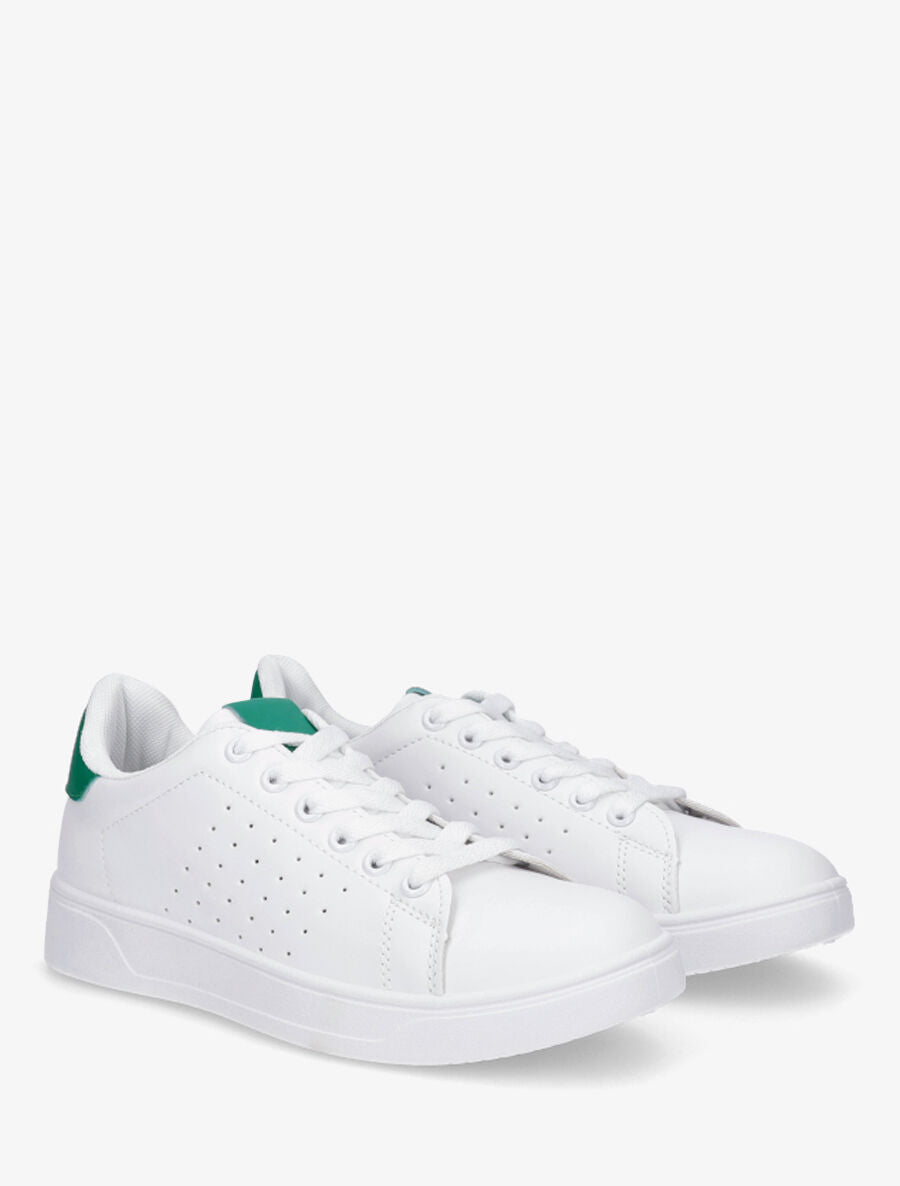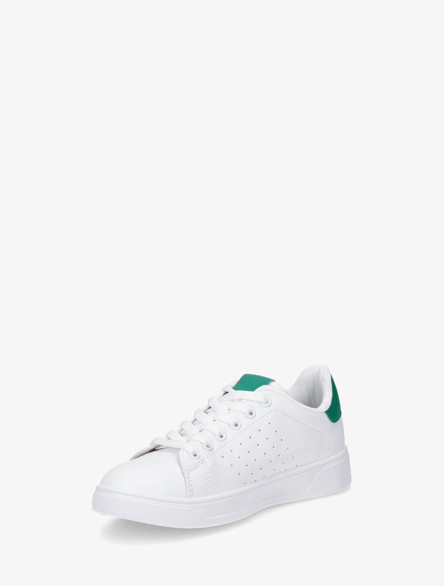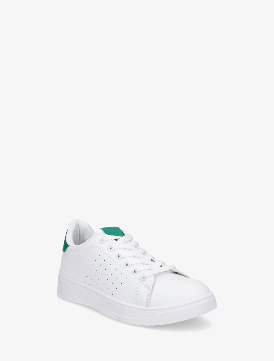 Ces baskets urbaines en simili cuir blanc affichent un style intemporel revisité avec un contrefort vert contrastant. Leur design épuré présente des perforations discrètes sur l'empeigne et des bouts ronds pour un confort optimal. La semelle blanche de 3 cm apporte une touche sportive moderne. Le système de laçage assure un maintien ajusté tout au long de la journée. Parfaites pour composer des tenues décontractées au quotidien, elles s'accordent aussi bien avec un jean qu'une jupe fluide. Un essentiel polyvalent pour votre garde-robe.