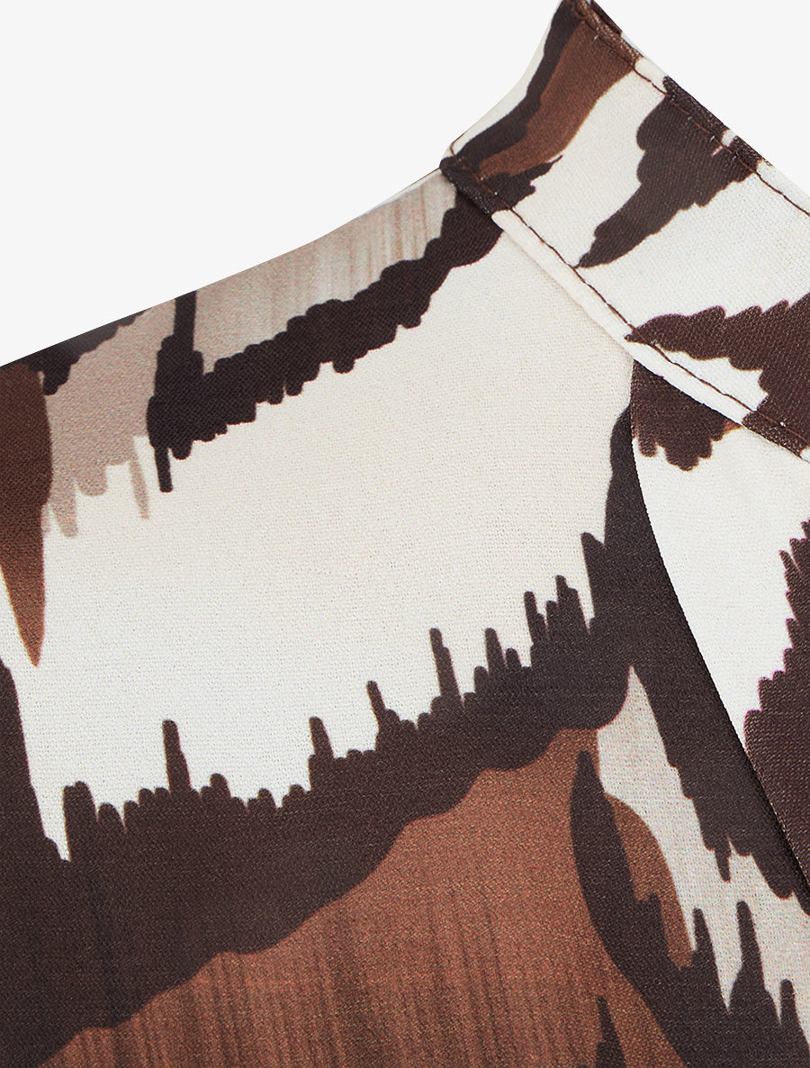 Ce top fluide marron séduit par son imprimé abstrait raffiné et sa coupe boule moderne. Son col V à revers apporte une touche sophistiquée, tandis que les manches longues avec poignets élastiqués assurent un confort optimal. Les bords élastiqués garantissent un tombé impeccable. Confectionné en Italie avec une composition stretch, ce haut allie fluidité et liberté de mouvement. Parfait pour composer des tenues contemporaines au quotidien comme en soirée, il se porte aussi bien avec un pantalon ajusté qu'une jupe midi pour un look équilibré et actuel.