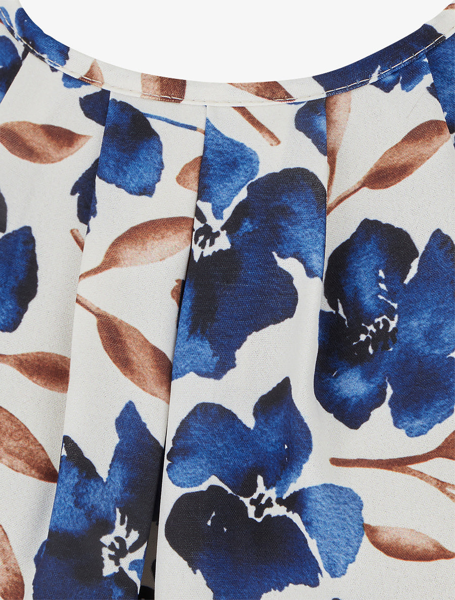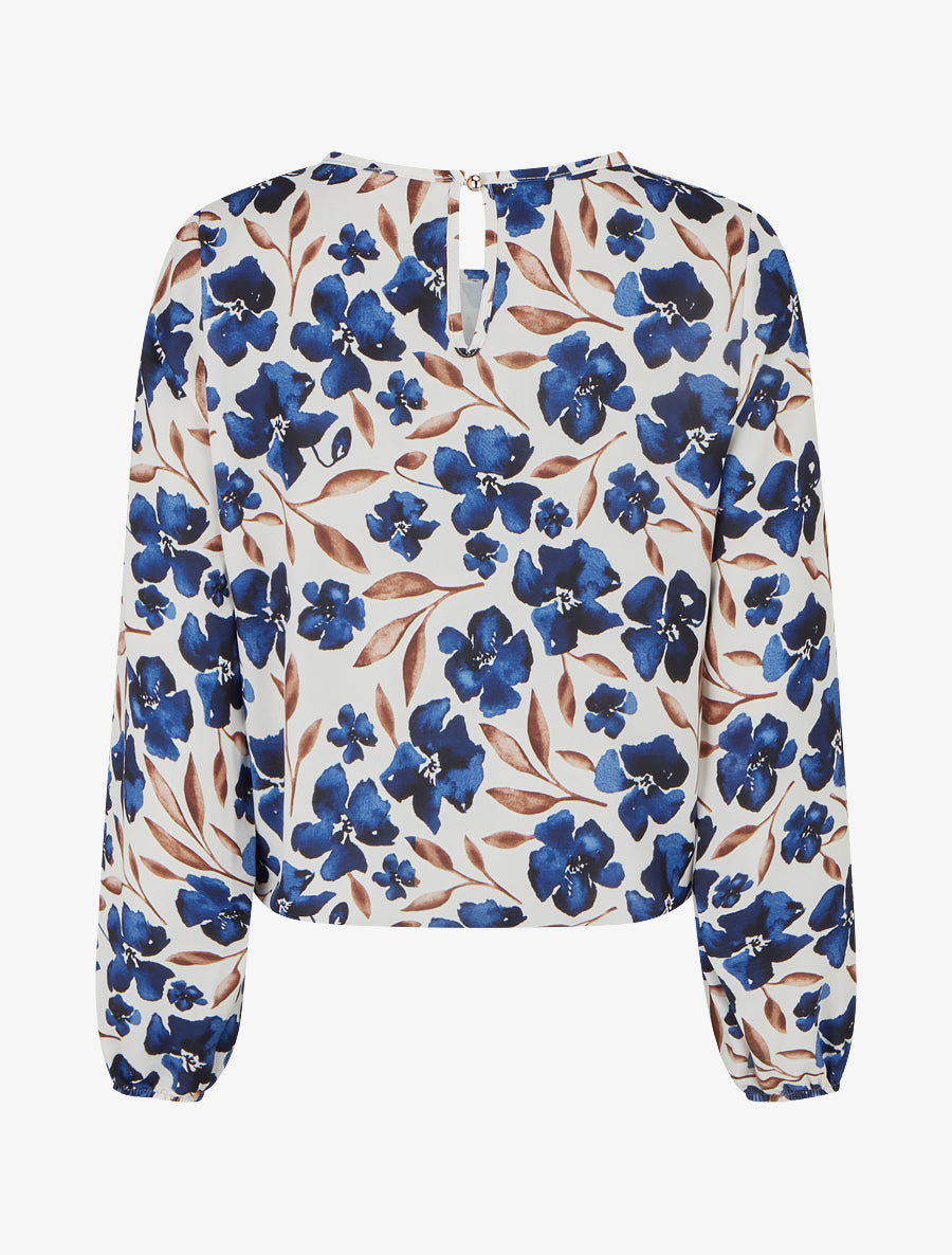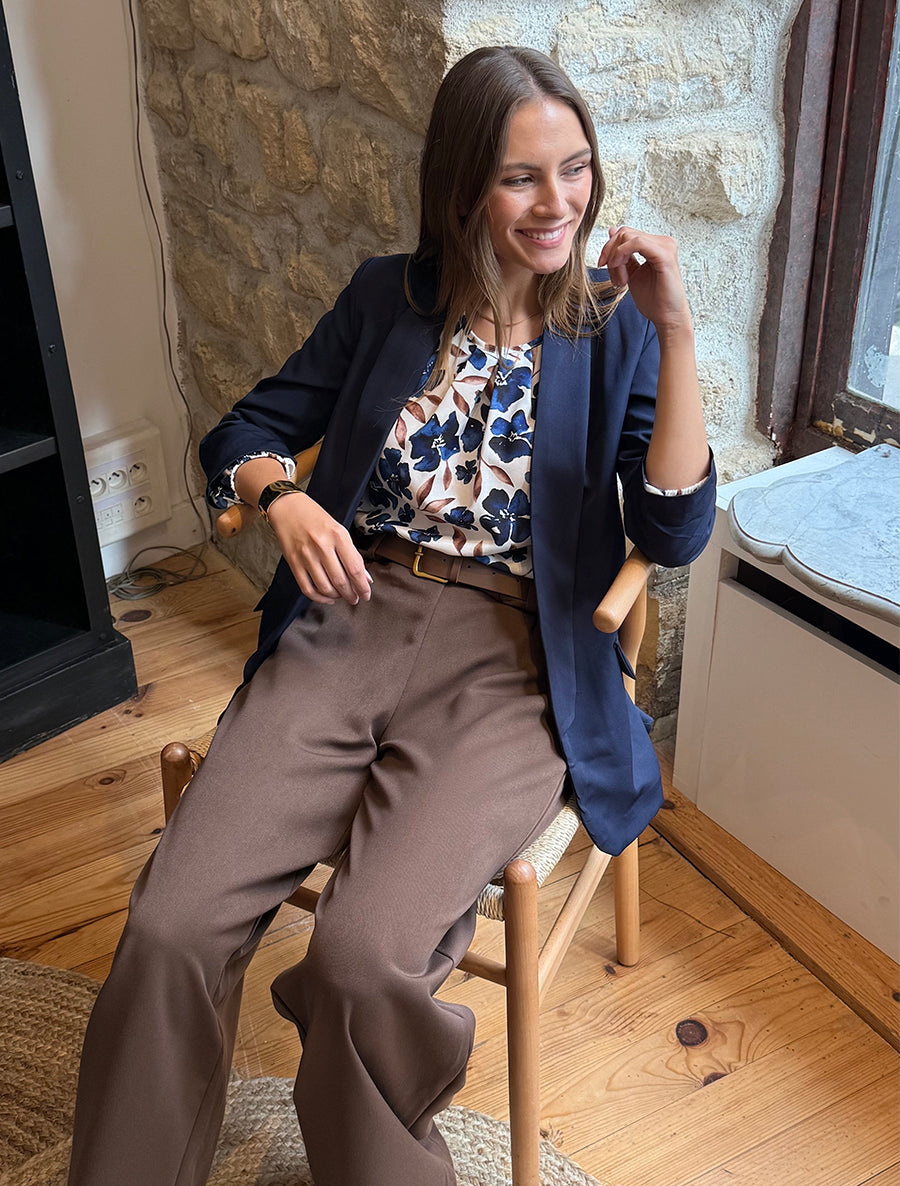 Succombez au charme de ce top fluide à la coupe boule élégamment féminine. Son imprimé fleuri marine apporte une touche de fraîcheur, tandis que le col rond à fronces et la nuque boutonnée ajoutent une dimension raffinée. Les manches longues avec poignets élastiqués et les bords ajustés garantissent un maintien optimal et un confort absolu. Sa matière fluide en polyester offre une liberté de mouvement idéale. Fabriqué en Italie avec un savoir-faire artisanal, ce top se porte aussi bien au bureau qu'en sortie décontractée.