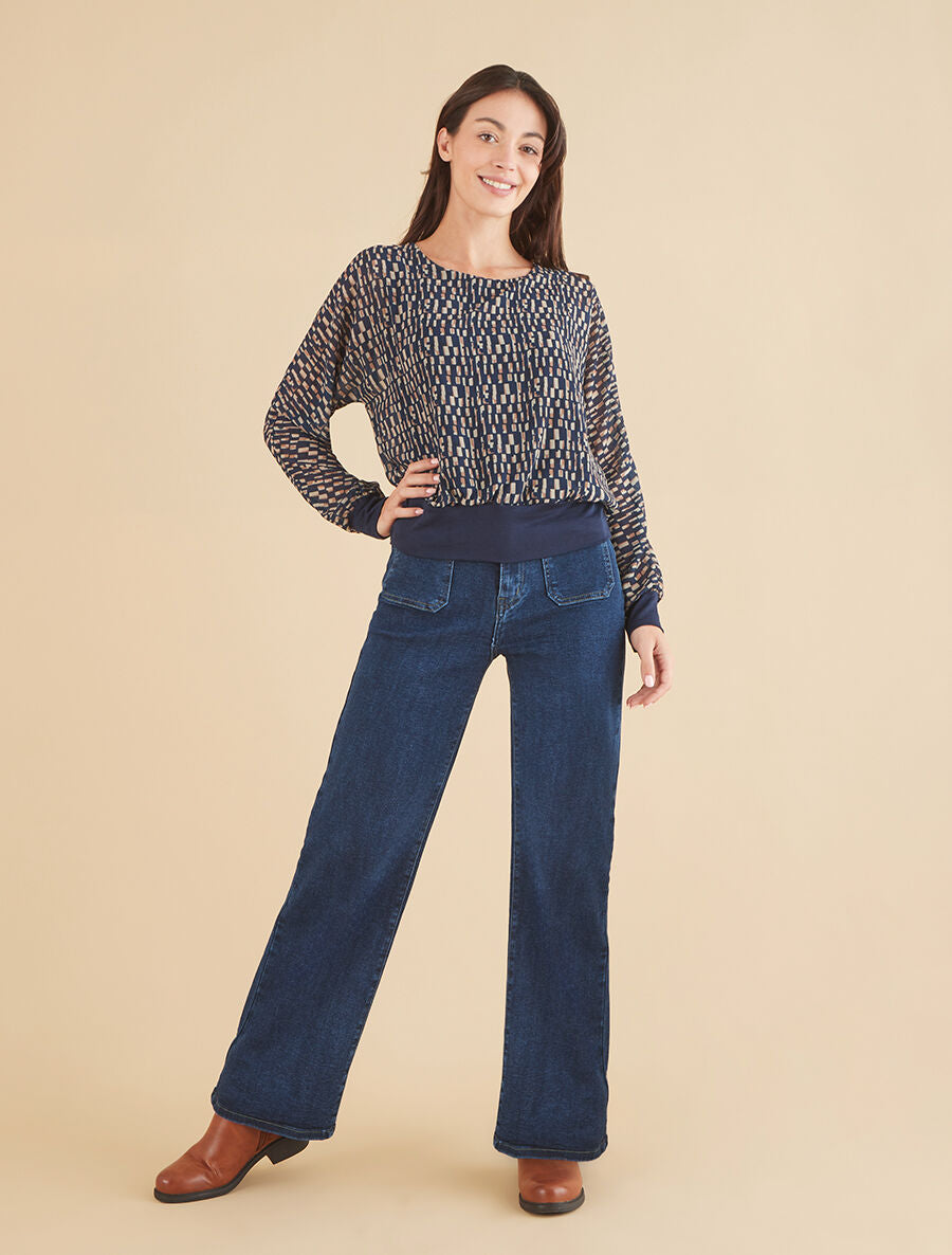 Ce top en voile dévoile une coupe boule flatteuse sublimée par un imprimé géométrique raffiné. Confectionné en Italie, il séduit par son encolure ronde féminine et ses manches longues élégantes. La doublure assure un confort optimal tandis que les bords contrastants apportent une touche de modernité. Sa composition en viscose et polyester garantit une fluidité exceptionnelle et un tombé parfait. Idéal pour composer des tenues sophistiquées au quotidien comme lors d'occasions spéciales, ce top marine s'impose comme une pièce incontournable de votre garde-robe.