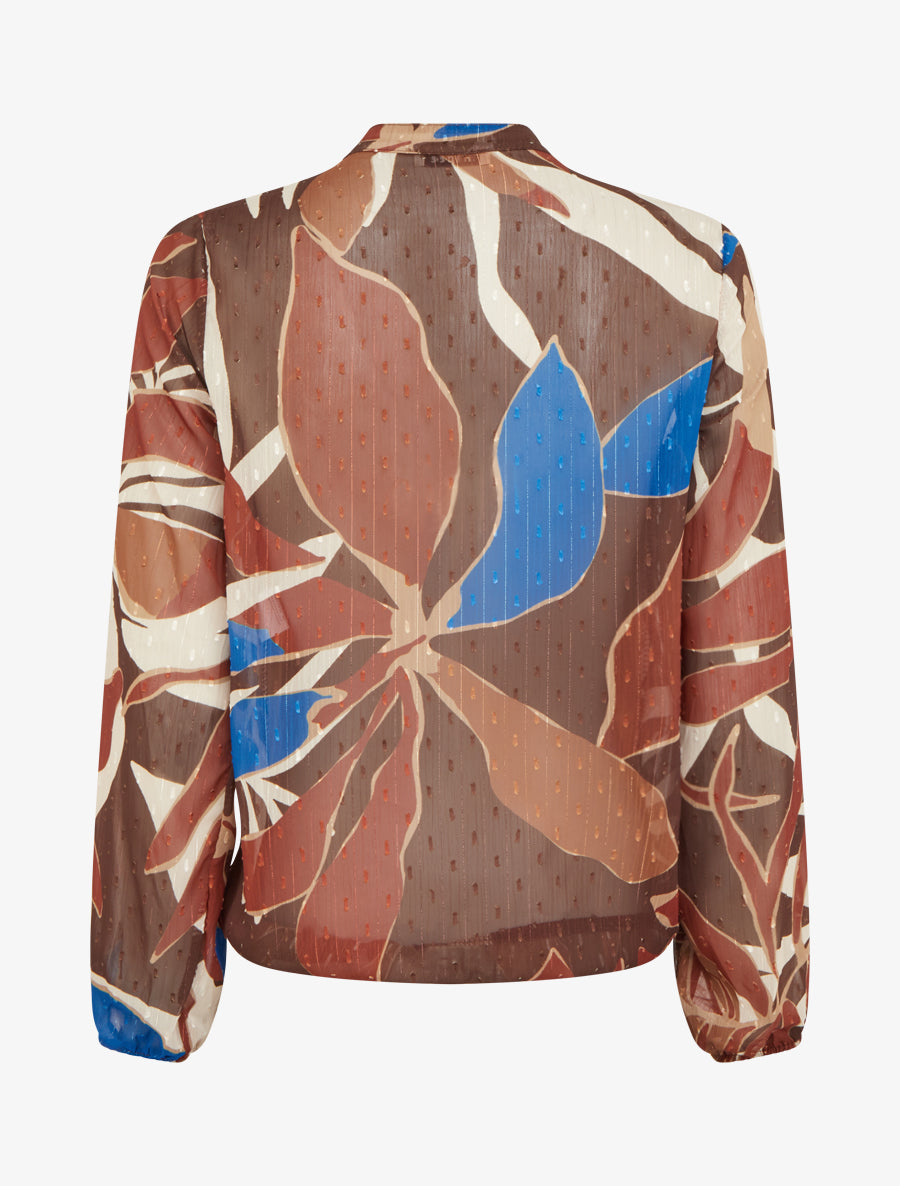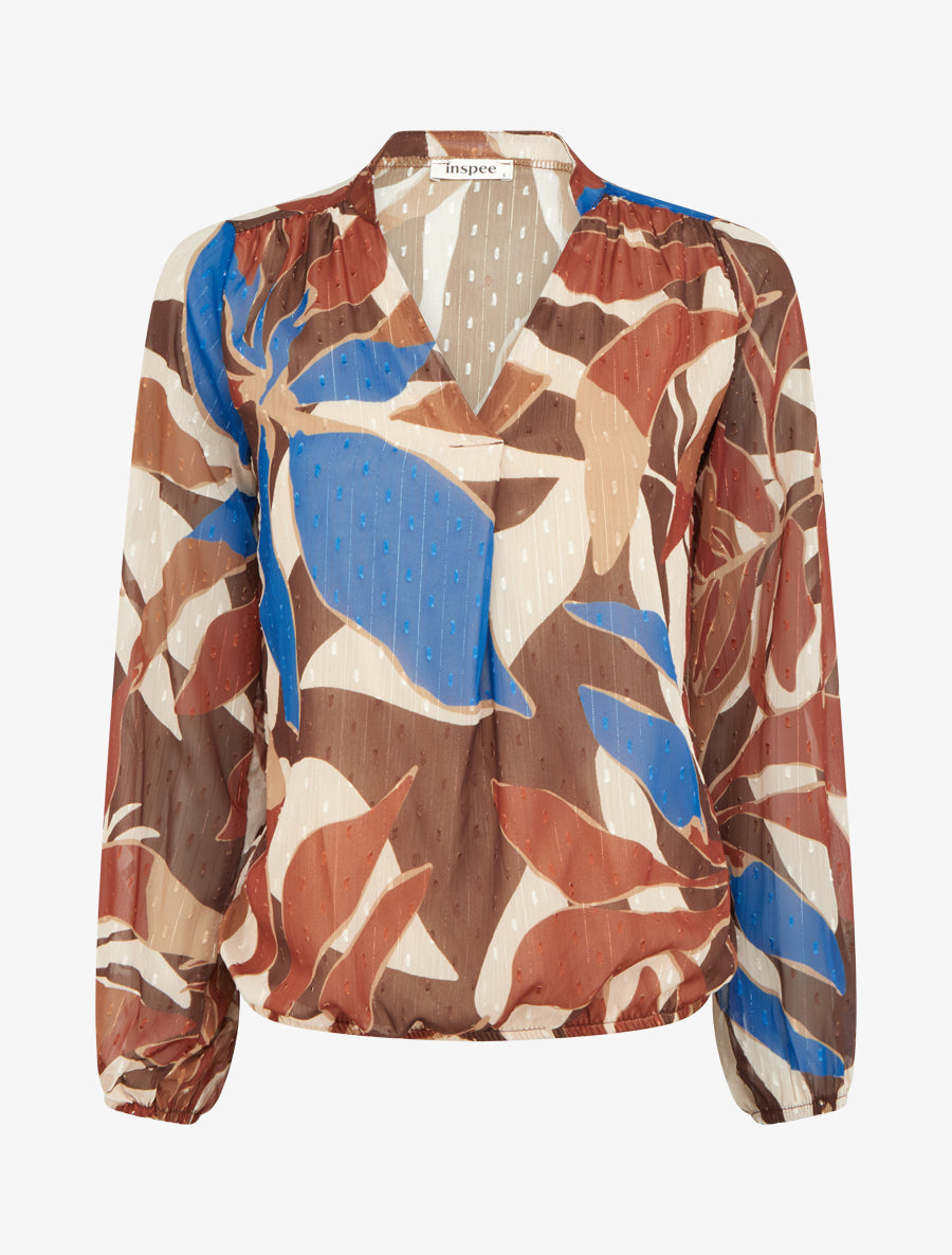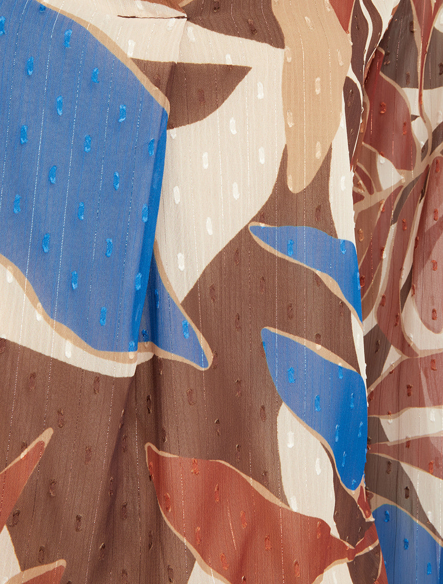 Découvrez ce top en voile irisé qui sublime la silhouette grâce à sa coupe boule raffinée. Son col V flatteur et ses manches longues à poignets élastiqués assurent un confort optimal. L'imprimé feuilles apporte une touche végétale sophistiquée tandis que la doublure avant garantit une opacité parfaite. Les bords élastiqués structurent harmonieusement la silhouette. Confectionné en Italie avec un savoir-faire d'exception, ce top se porte aussi bien au bureau qu'en soirée, accompagné d'un pantalon fluide ou d'une jupe midi. Une pièce polyvalente qui traverse les saisons avec élégance.