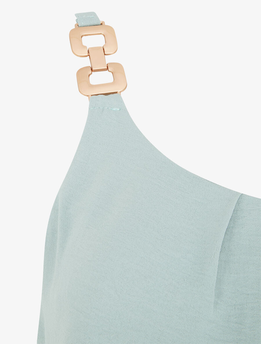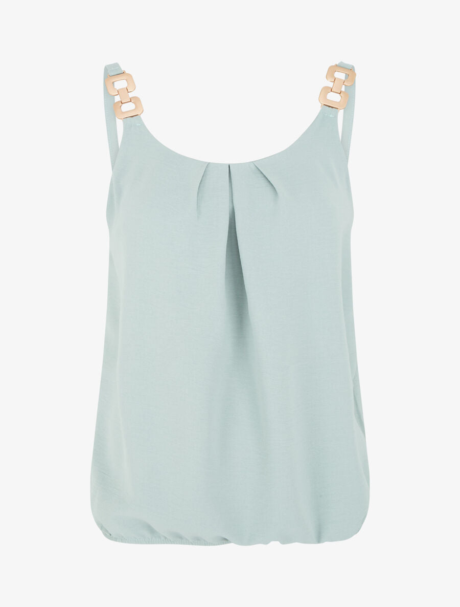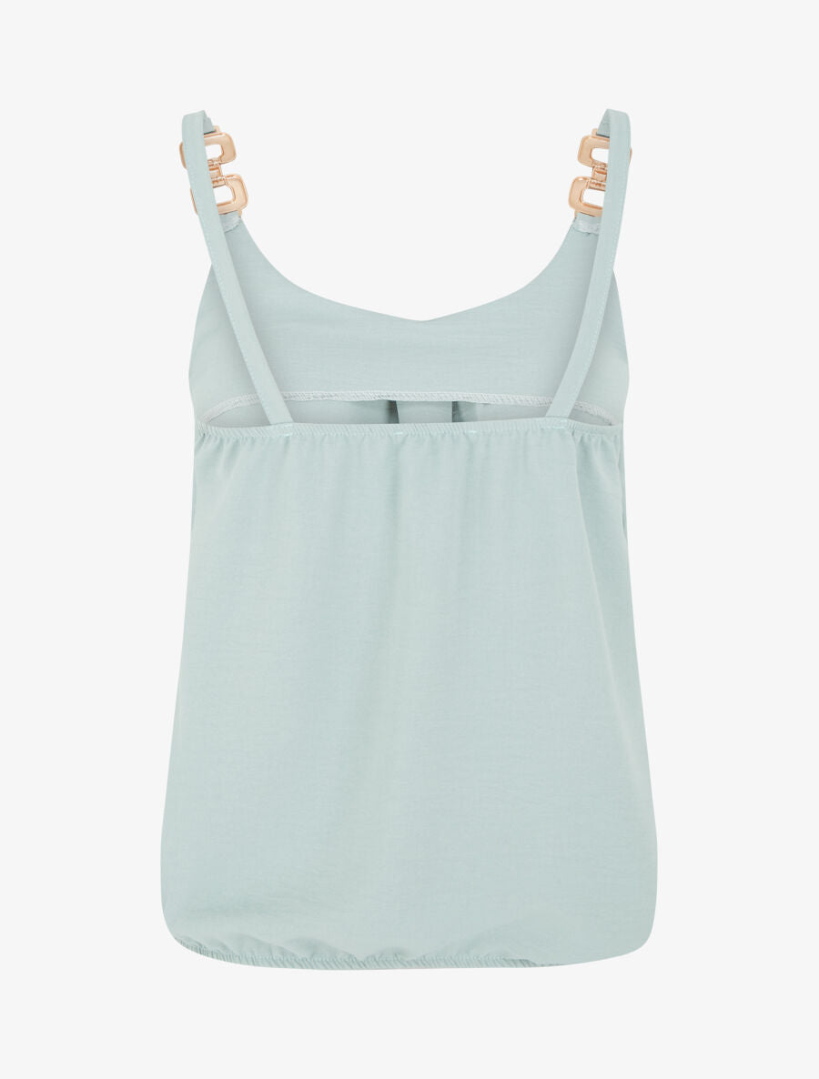 Craquez pour ce top vert d'eau à la coupe boule flatteuse et moderne. Ses bretelles rehaussées d'un empiècement métallique apportent une touche sophistiquée à cette pièce bi-matière. L'encolure ronde adoucit la silhouette tandis que la composition stretch assure un confort optimal tout au long de la journée. Confectionné en Italie avec un savoir-faire reconnu, ce haut se porte aussi bien au bureau avec un pantalon tailleur que pour vos sorties décontractées avec un jean. Une valeur sûre pour sublimer votre garde-robe estivale.