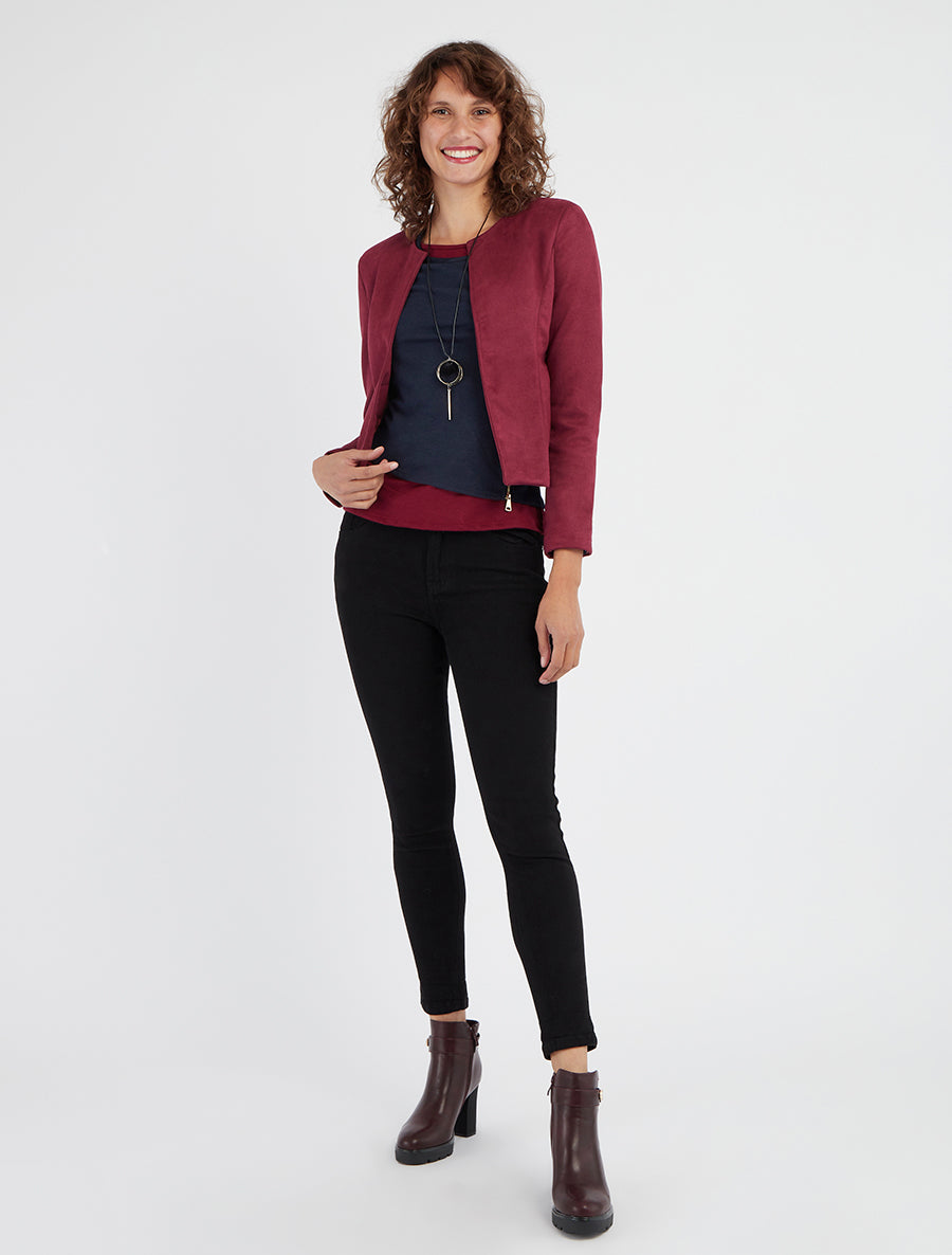 Découvrez cette veste en suédine bordeaux au style affirmé, confectionnée en Italie avec un savoir-faire d'exception. Sa coupe droite et son col rond apportent une silhouette structurée, tandis que les épaulettes marquées renforcent le caractère moderne de cette pièce. Les manches longues et la doublure intérieure garantissent un confort optimal. Son ouverture sans fermeture permet un porté décontracté et facile à associer. Parfaite pour sublimer vos looks du quotidien comme vos tenues plus travaillées, cette veste courte s'impose comme l'alliée mode incontournable de votre garde-robe automnale et hivernale.